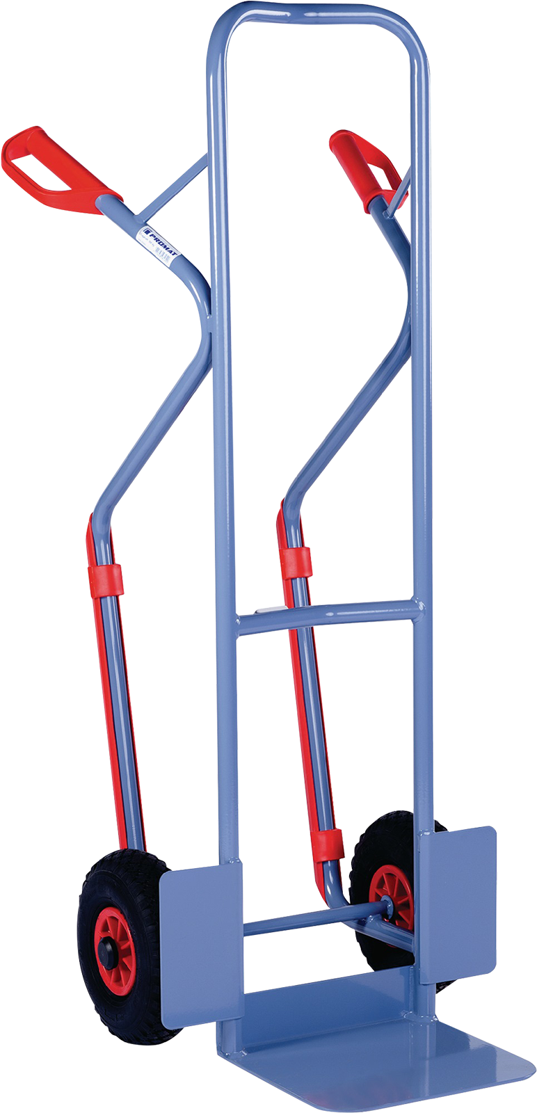 mit Kufen · stabile, geschweißte Stahlrohrkonstruktion · Stahlblechschaufel, Radschutz und Sicherheitsgriffe · pulverbeschichtet taubenblau, RAL 5014 · Kufen mit Treppenkantenschutz · Luftbereifung · H1300mm · Tragfähigkeit 300 kg · Schaufelgröße L250xB320mm