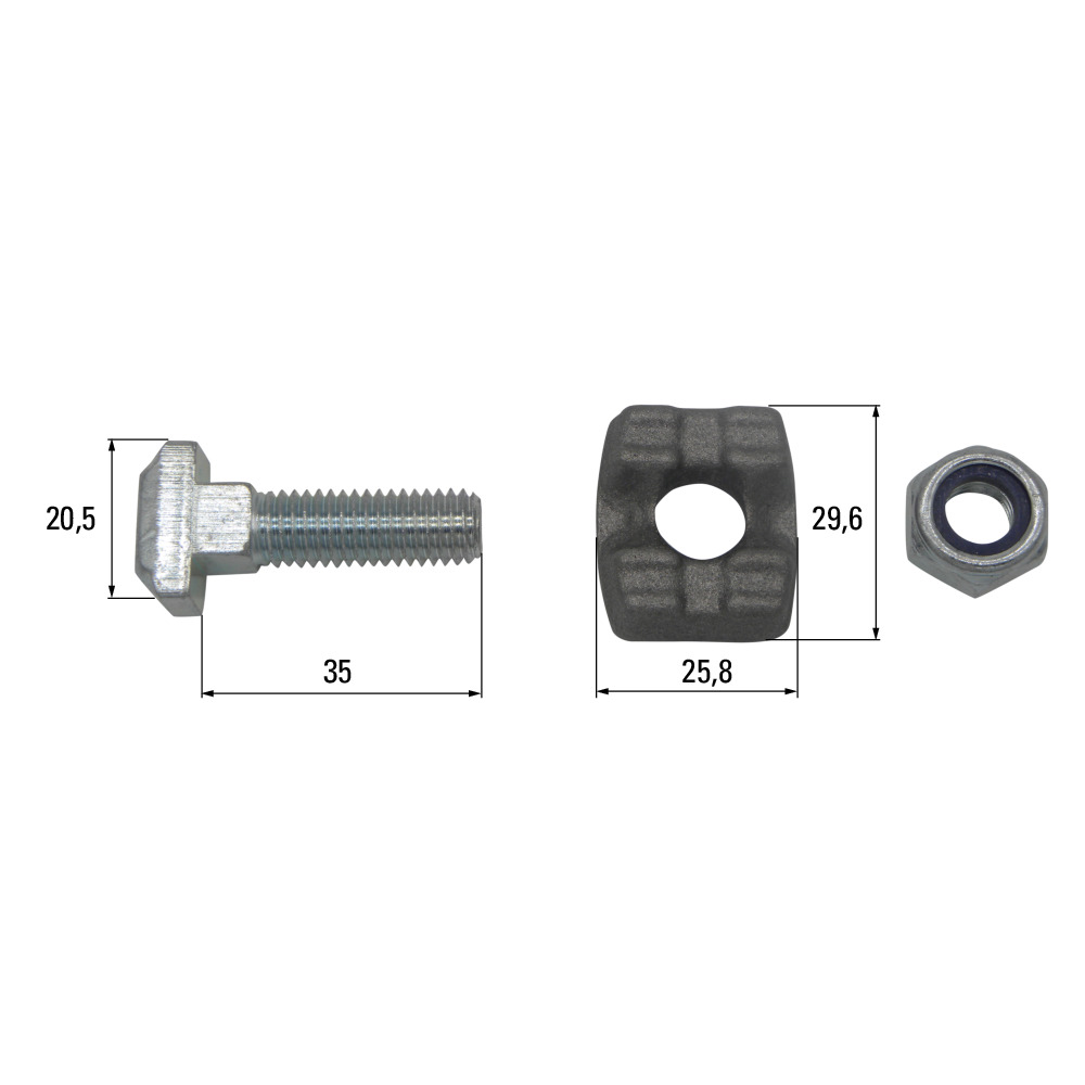 Steckschraubengarnitur M10x35 passend zu Kratzbodenkette 8x31, 9x31. Die Kettenschraubengarnitur besteht aus Kettenschraube, Druckstück und Sicherungsmutter.
