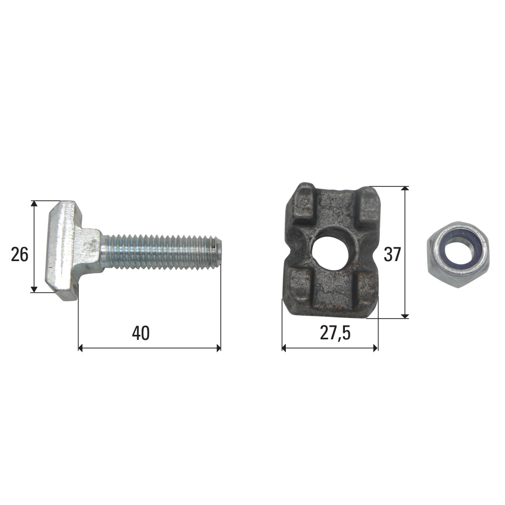 Steckschraubengarnitur M10x40 passend zu Kratzbodenkette 10x31, 10x35, 10x38, 11x31, 11x35. Die Kettenschraubengarnitur besteht aus Kettenschraube, Druckstück und Sicherungsmutter.