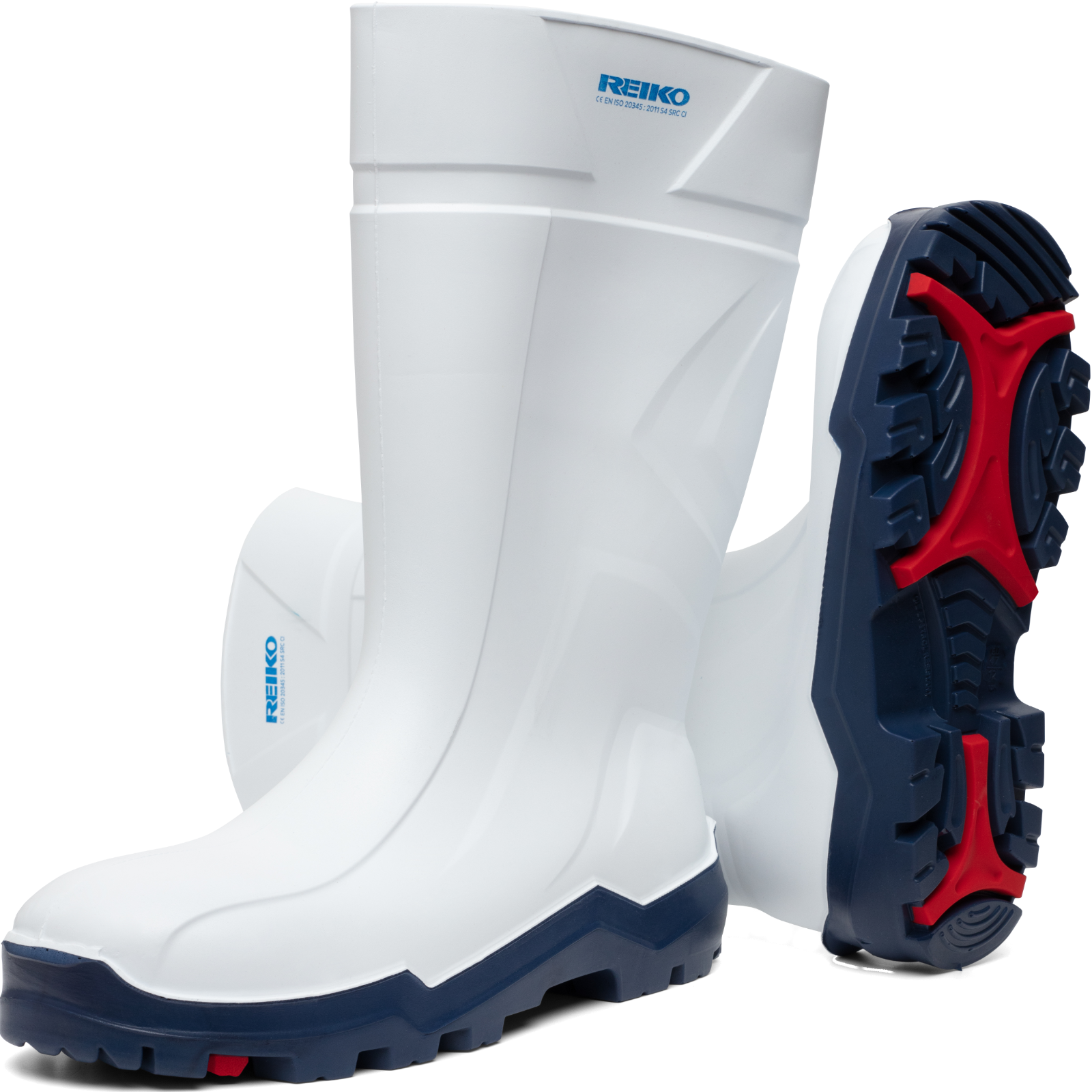 Stiefel aus PU mit Stahlkappe und S4In Weiß mit blauer/roter Sohle.Öl und benzinresistent