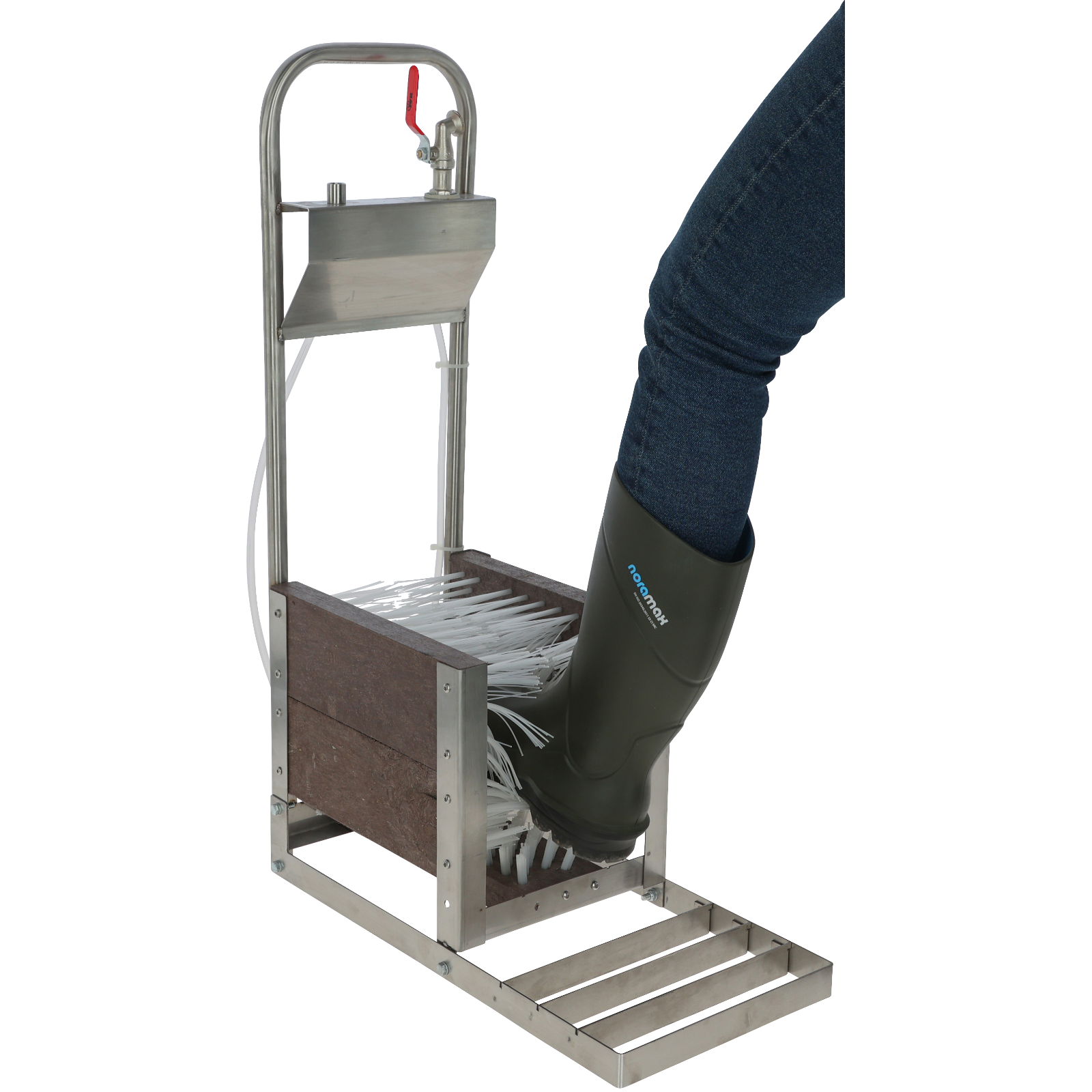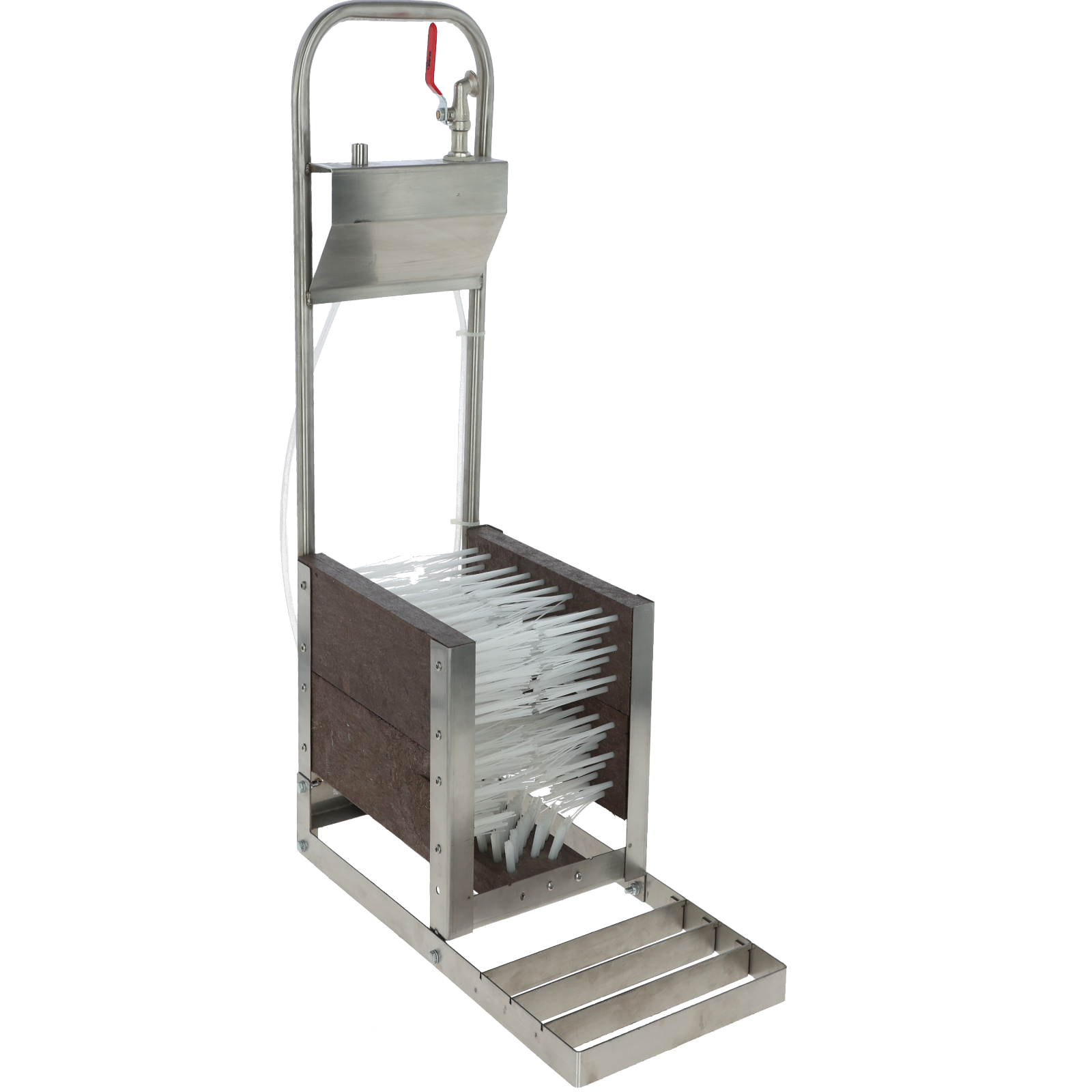 Wasseranschluss 1/2 Zoll (Kugelhahn mit Tülle). Rutsch- und trittsicher, komplett mit 5 Bürsten und Abklopfrost. Robuste Edelstahlausführung, mühelose Reinigung mit Wasser.