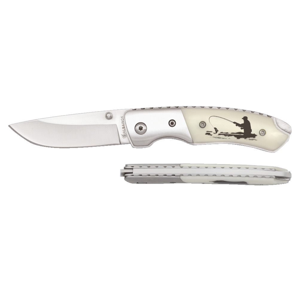 Formschönes Taschenmesser aus 440A Stahl- Rostfrei. Klingenlänge 6,5 cm, Zwinge aus Edelstahl. Griff ABS mit Anglermotiv. Aufgeklappt ist das Messer 17 cm lang.