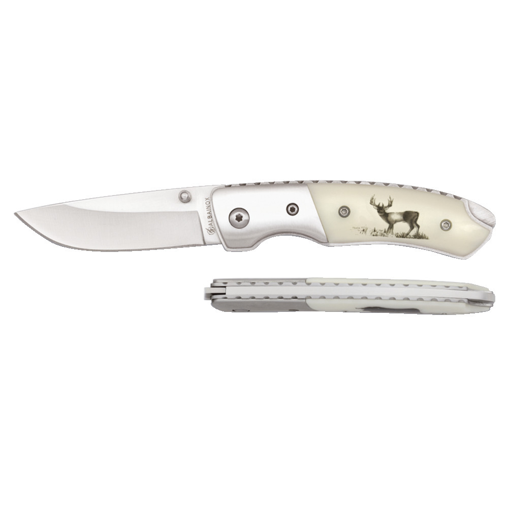 Formschönes Taschenmesser aus 440A Stahl- Rostfrei. Klingenlänge 6,5 cm, Zwinge aus Edelstahl. Griff ABS mit Hirschmotiv. Aufgeklappt ist das Messer 17 cm lang.