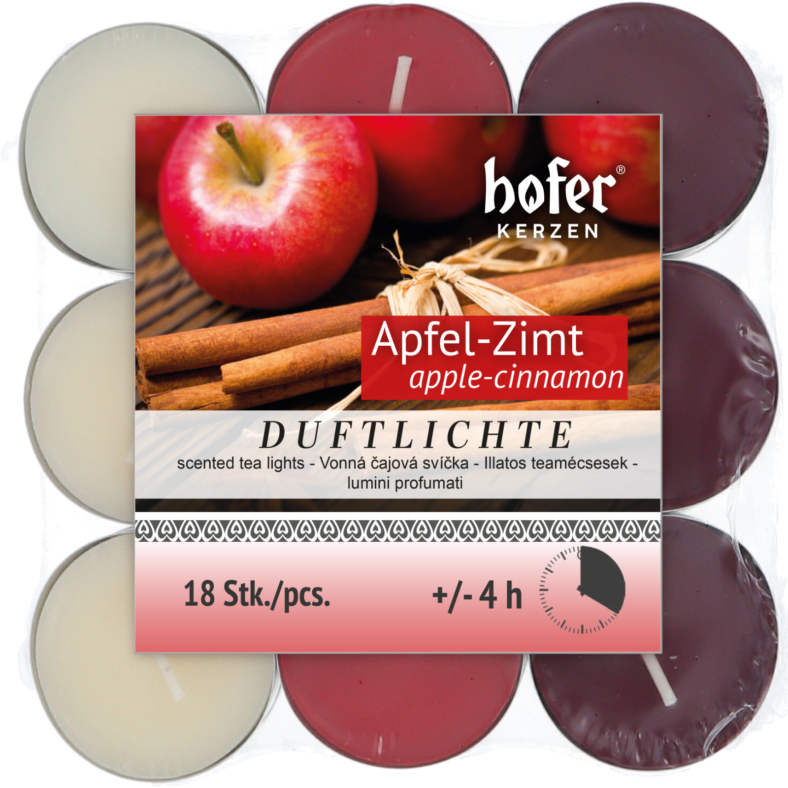 Vorteilspack: 18 Duft-Teelichter Apfel-ZimtDieser Vorteilspack bringt Gemütlichkeit ins Haus: 18 Hofer Duft-Teelichter mit Metallhülle, gefüllt mit hochwertigem Wachs und einem feinen Apfel-Zimt Duft.Die angenehme Note sorgt für eine warme und entspannte Atmosphäre – ideal fürs Wohnzimmer, Bad oder einfach für eine kleine Auszeit zwischendurch.Dank ihrer kompakten Größe passen die Teelichter in fast jedes Windlicht oder auf den gedeckten Tisch.Mit rund 4 Stunden Brenndauer spenden sie den ganzen Abend über sanften, flackernden Kerzenschein.Gut zu wissen:Die Kerzen sind gegossen, der Docht ist fest eingesetzt.Kleine Dellen an der Metallhülle können durch Transport entstehen, lassen sich aber leicht von Hand ausgleichen – ohne Einfluss auf die Brennqualität.Sicherheitshinweis:Bitte nur auf feuerfesten, hitzebeständigen Unterlagen verwenden.Nach dem Anzünden nicht mehr bewegen. Werden mehrere Teelichter verwendet, bitte ausreichend Abstand lassen, um Hitzestau zu vermeiden.Durchmesser: 40 mmHöhe: 15 mmBrenndauer ca. 4 h