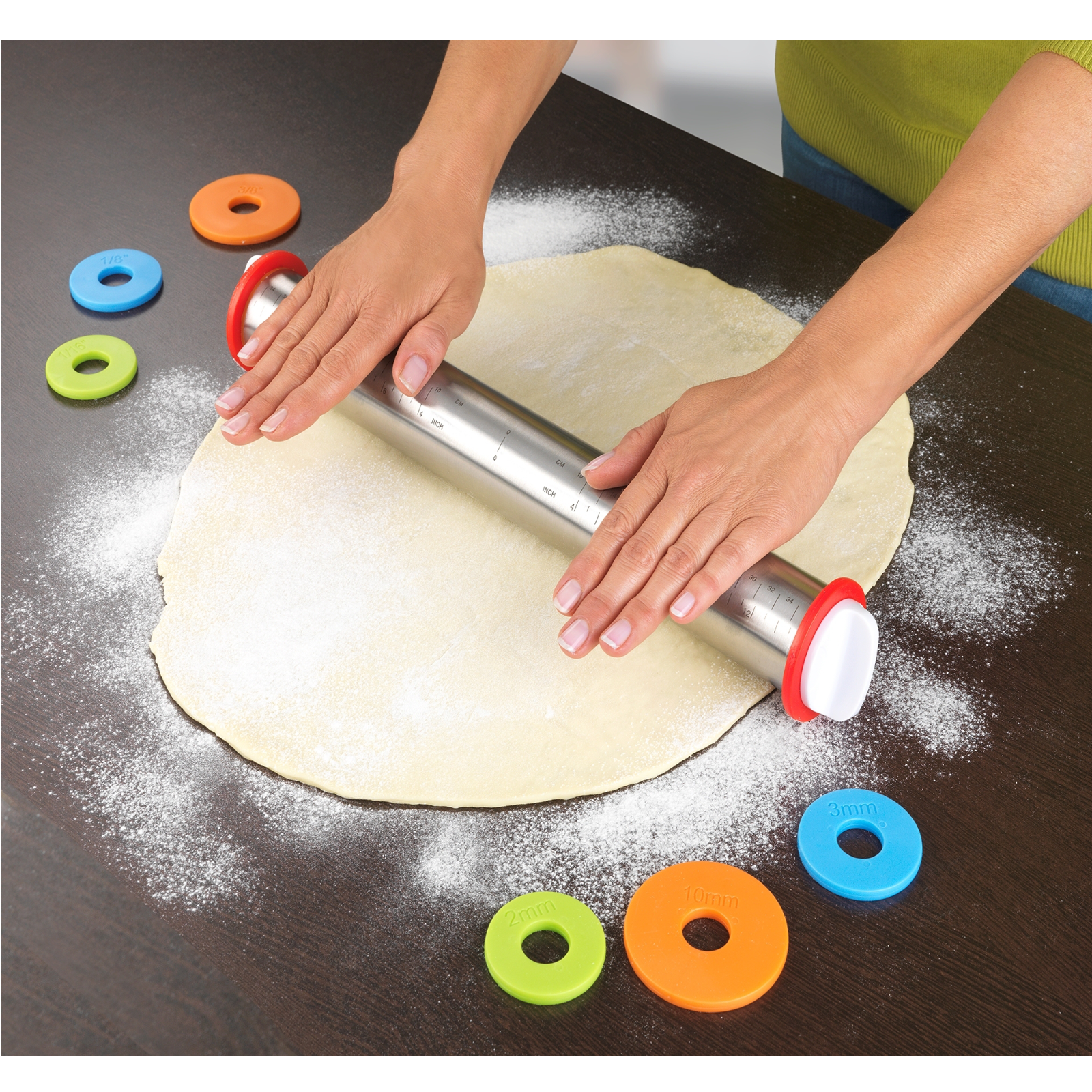 Eine Edelstahl-Teigrolle für 4 Teighöhendurch die aufsteckbaren Abstandhaltern und der aufgedruckten Mess-Skala (bis 34 cm) können Sie jeden Teigauf die gewünschte Höhe und Breite ausrollen, für gleichmäßige Teigdicke von je 2 - 10 mm.Ideal für Pizza, Kekserlteige, Kuchenboden oder Nudelteige.Die Rolle ist aus hochwertigem, langlebigen Edelstahl, die Abstandsscheiben aus PP.SpülmaschinengeeignetMaße: 43 x 6,5 cm