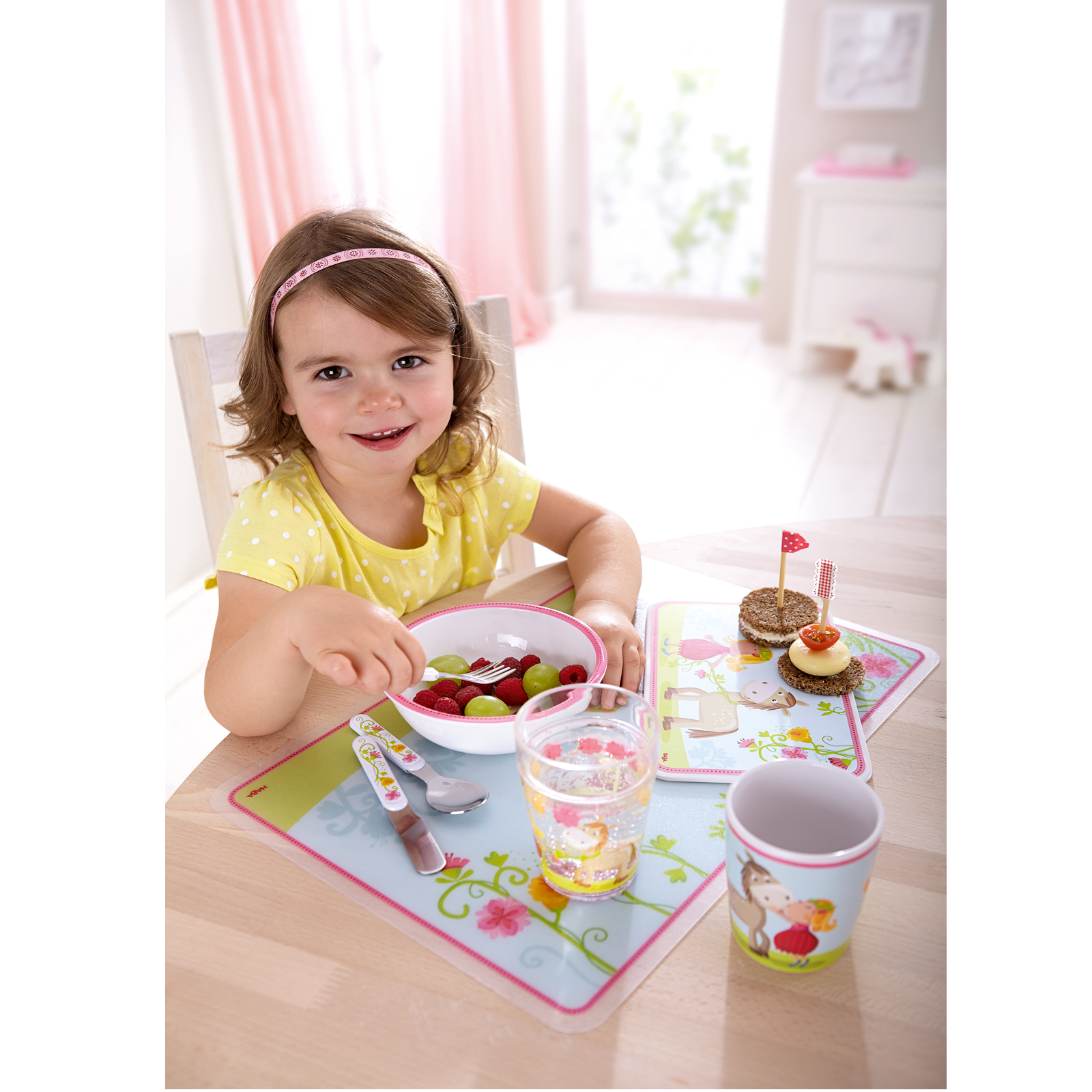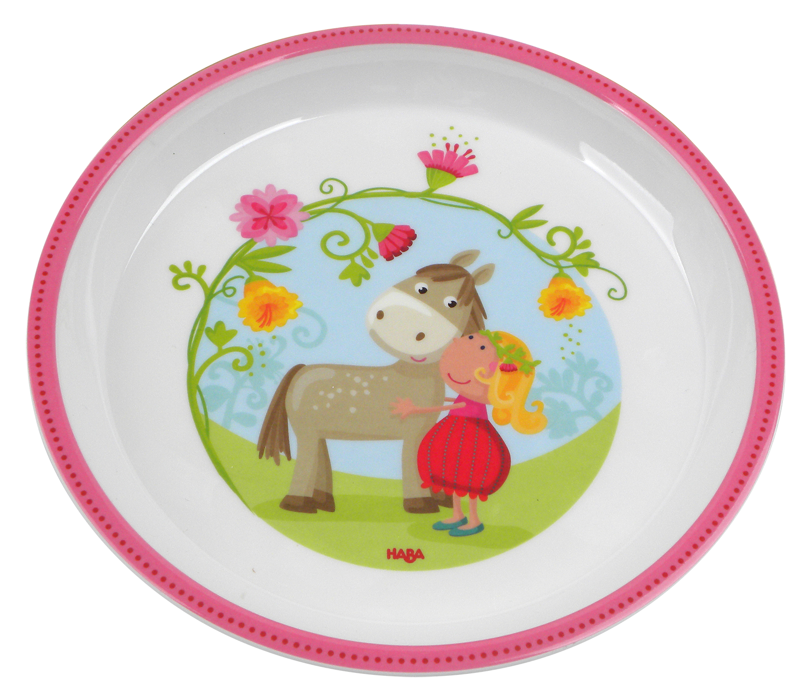 Der niedliche HABA-Melamin-Teller Vicki & Pirli zeigt die Freunde Vicki und Pirli umgeben von frühlingshaften Blütenranken.Das goldige Motiv sorgt schon beim Frühstück für gute Laune. Da wollen kleine Essanfänger am liebsten gleich selber essen.Dabei unterstützt sie der Gummiring an der Unterseite des Kindertellers, denn er verhindert das Wegrutschen.Und wenn es beim Frühstücken am Tisch mal wieder besonders heiß hergeht – kein Problem, denn der Teller aus robustem Melamin macht so einiges mit.Und zur Freude aller Eltern darf der HABA-Melamin-Teller Vicki & Pirli sogar in die Spülmaschine.Material: Melamin, spülmaschinengeeignet. Maße: Ø 18 cm.