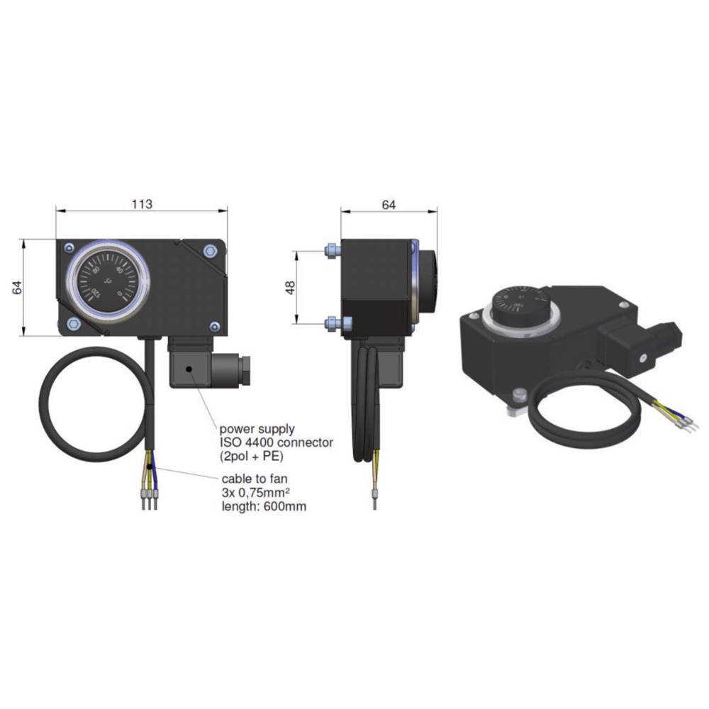 Die Temperaturregelung ist ein System mit einem verstellbaren Thermostat, ohne Ölberührung. Die Schalttemperatur kann auf dem Drehknopf am Gehäuse verstellt werden. Weiters kann die Regelung auf das „rail System" der Ölluftkühler Serie asa rail montiert werden. Dadurch kann die Regelung flexibel auf eine gewünschte Position geschoben und anschließend festgezogen werden. Die Endverkabelung zum Lüfter muss individuell vom Kunden durchgeführt werden.Gehäusematerial: Stahlblech, pulverbeschichtetEinbaulage: beliebigverstellbarer Schaltbereich: -30/+120°CSchaltleistung C.1-10/2,5)A/250V, C2-6(2,5)A/250Vmax. Temperatur des Kopfes: +85°Cmax. Fühlertemperatur: +150°C