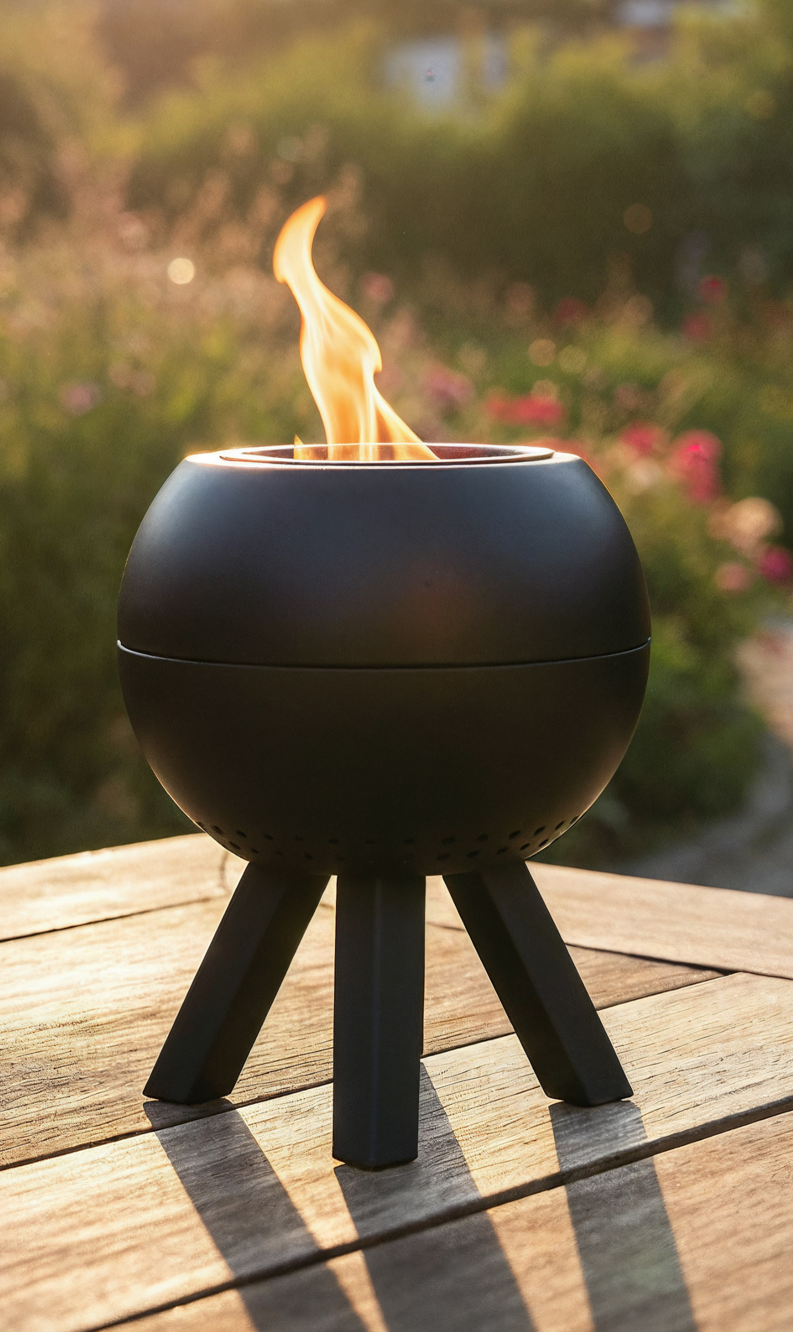 Das Tischfeuer Peluma in elegantem Schwarz vereint modernes Design mit praktischer Funktion. Die kompakte Feuerstelle sorgt für ein echtes Flammenbild – ideal für stimmungsvolle Momente auf Balkon, Terrasse oder im Garten.