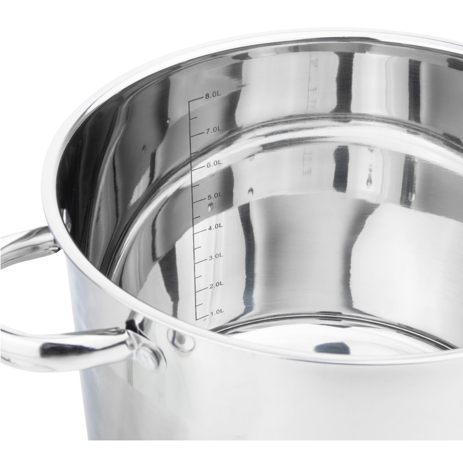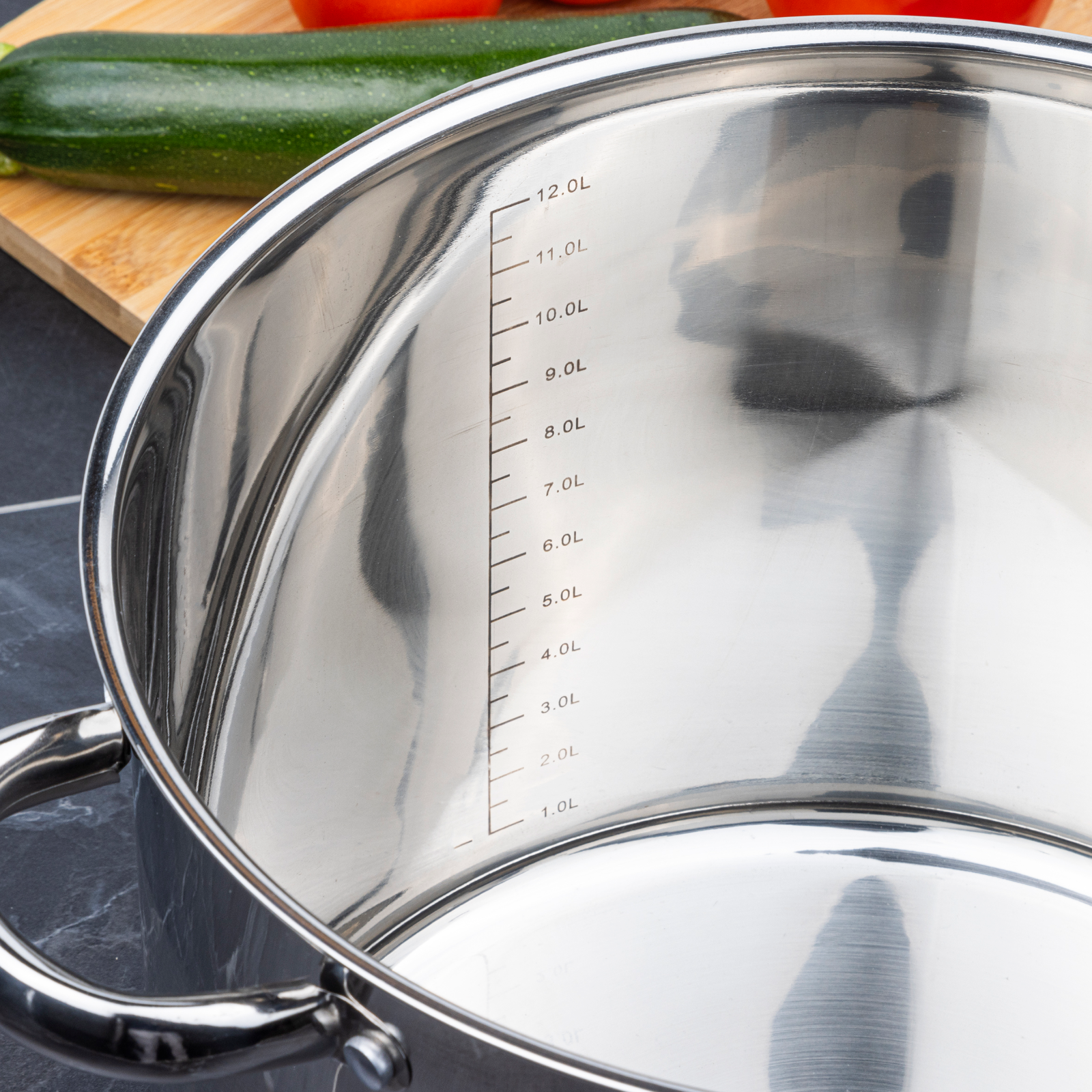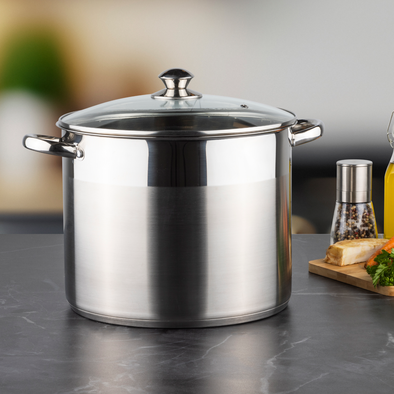 Der ideale 14-Liter-Topf für große Portionen: Dieser Kochtopf aus hochwertigem Edelstahl 201 überzeugt durch seine robuste Bauweise (0,6 mm Materialstärke)und den energiesparenden 2,6 mm Kapselboden.Der Glasdeckel mit Edelstahlrand ermöglicht ein bequemes Beobachten des Kochvorgangs.Dank der integrierten Skala ist das Dosieren von Flüssigkeiten ein Kinderspiel.Das glänzende, polierte Design mit stabilen Edelstahlgriffen und -knopf macht diesen Topf zu einem attraktiven und funktionalen Begleiter in Ihrer Küche.Für alle Herdarten geeignet, inklusive Induktion.Maße: Ø 28 Höhe: 22,5cm.