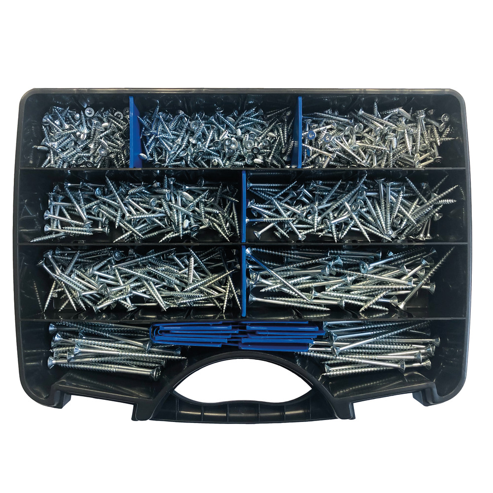 Umfangreiche Box mit verzinkten Torx Spanplattenschrauben in praktischer, stabiler Aufbewahrungs- und Transportbox mit hochwertigen Verschlüssen und stabilen Unterteilern - kein vermischen der verschiedenen Größen.Inhalt: 3,5 x 17 / 200 Stk. 3,5 x 20 / 200 Stk. 3,5 x 30 / 160 Stk. 4,0 x 35 / 100 Stk. 4,0 x 40 / 80 Stk. 4,0 x 50 / 80 Stk. 5,0 x 60 / 40 Stk. 5,0 x 80 / 40 Stk.