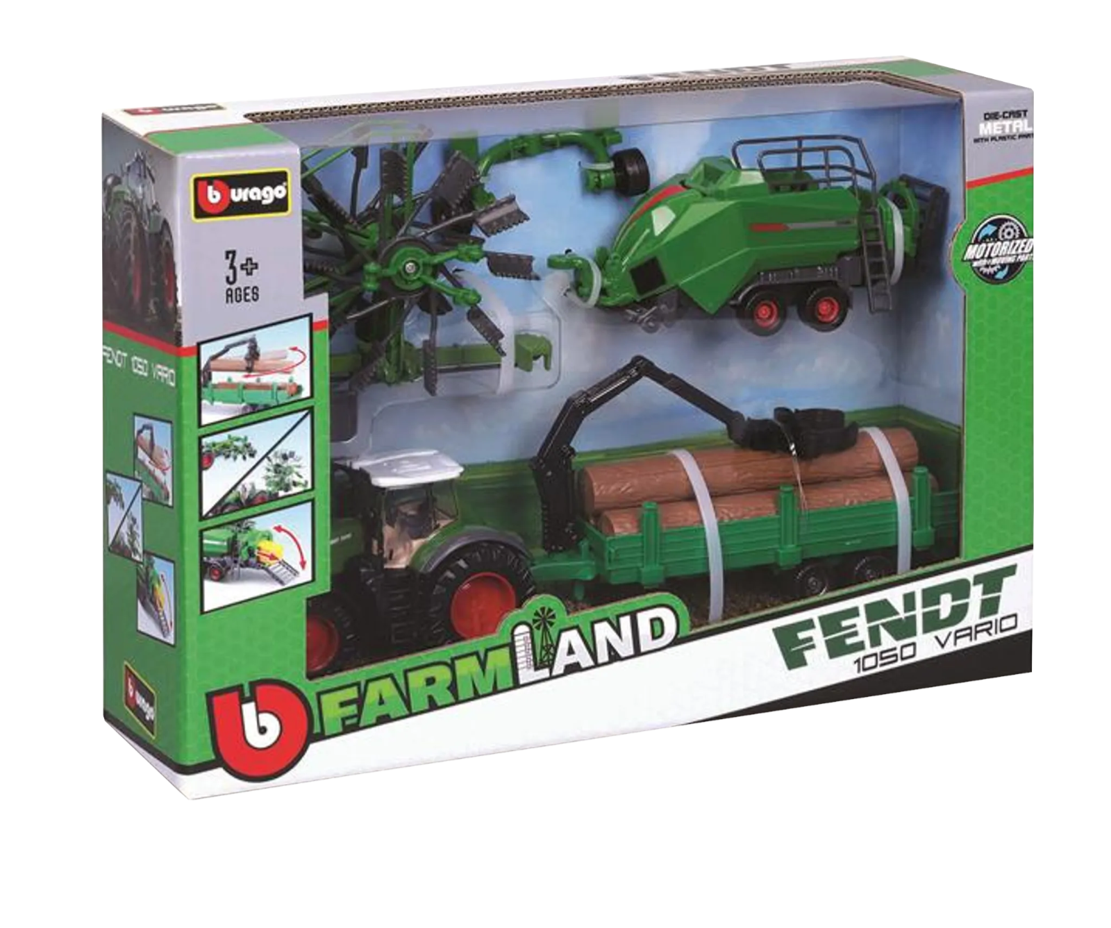 Mit diesem Traktor-Set von Bburago bist du für alle Arbeiten auf dem Feld oder im Wald bestens ausgestattet.