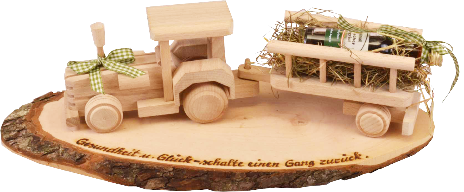 Hochwertig gearbeiteter Traktor mit Ladewagen aus Holz (ohne Inhalt) auf Rindenbrett mit Spruch: Gesundheit und Glück - schalte einen Gang zurück. Maße Brett: L:40 cm B:13cm.