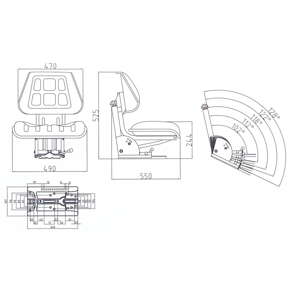 5-fache Neigungsverstellung der Grundplatte 0° / 12° / 16° / 20° / 22°. Kunstleder schwarz. Gewichtseinstellung 50 - 120 kg, Federung mit Gasdämpfer. Längsverstellung 160 mm, Federweg 80 mm. Maße BxHxT: 490 x 525 x 550 mm.