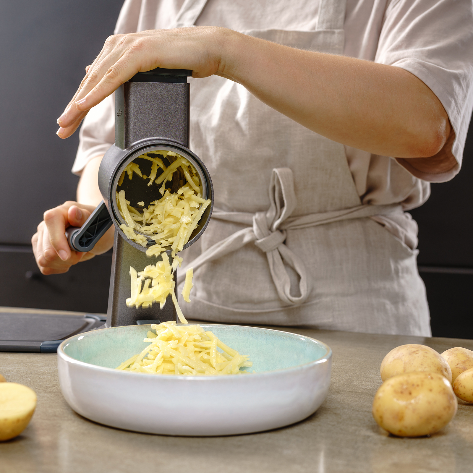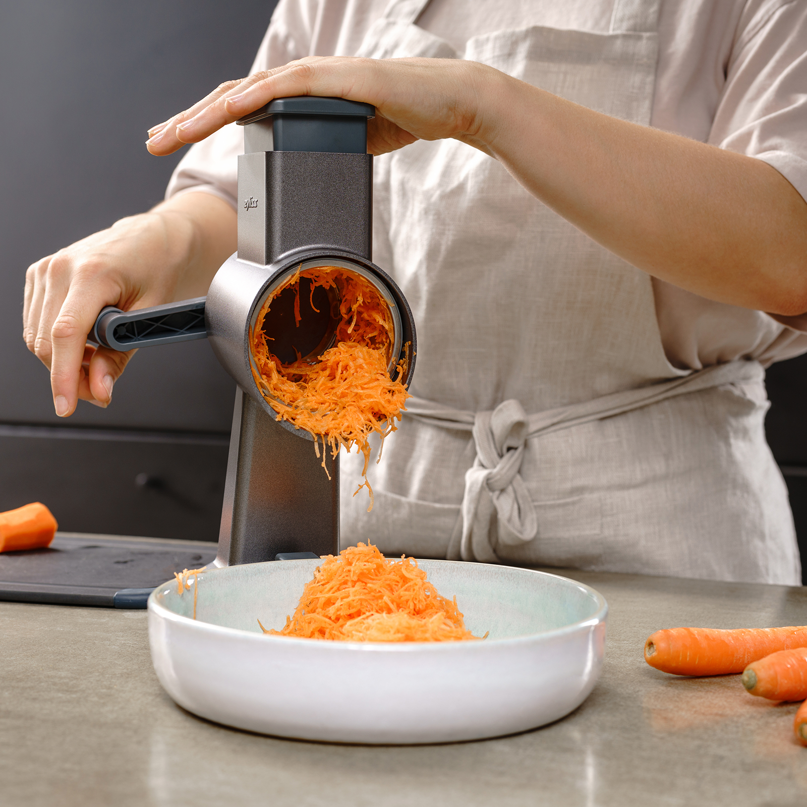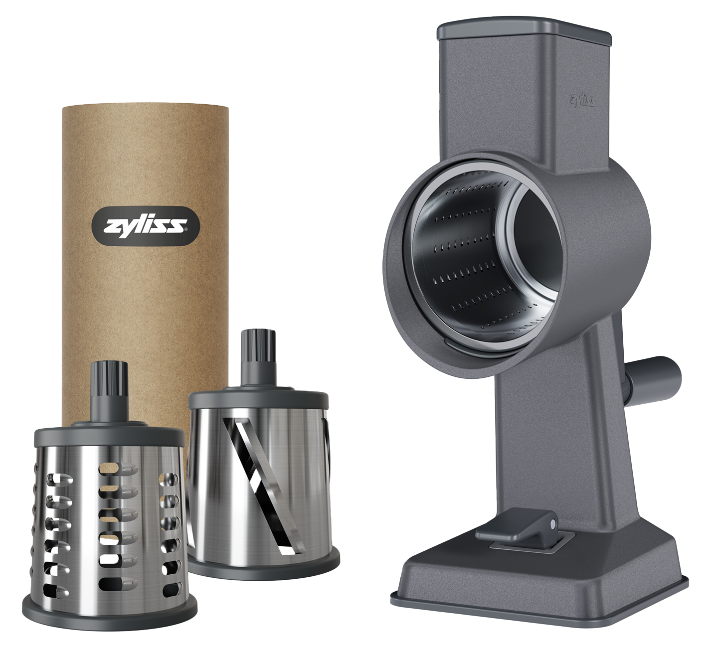 Ihr Küchenhelfer für schnelles und effizientes Reiben. Die Zyliss Alu Trommelreibe ist nicht nur für Profiköche eine Bereicherung, sondern auch für Hobbyköche und alle, die Wert auf eine gesunde und schnelle Küche legen. Die einfache Handhabung und schnelle Reinigung machen dieses Gerät zu einem unverzichtbaren Helfer in jeder Küche. Ob Sie eine große Familie zu versorgen haben oder einfach nur Wert auf frische und selbst zubereitete Mahlzeiten legen, die Zyliss Trommelreibe unterstützt Sie bei jedem Schritt. Das Design der Zyliss Alu Trommelreibe zeichnet sich durch seine hochwertige Aluminiumkonstruktion aus, die nicht nur für Langlebigkeit sorgt, sondern auch eine einfache Reinigung ermöglicht. Die Trommelreibe kommt mit verschiedenen Aufsätzen, sodass Sie die Größe und Form der geriebenen Lebensmittel nach Ihren Wünschen anpassen können:Bircher Universaltrommel (zum Raffeln von Äpfel, Karotten, Sellerie,...)Scheibentrommel (zum feinen Schneiden von Gurken, Kartoffeln (Chips), Zwiebel,...)Trommel grob (zum Reiben von Karotten, Kartoffeln, Gurken,...)Trommel fein (zum Reiben von Käse, Schokolade, Nüsse,...)Ein weiteres Highlight dieses Küchenhelfers ist seine Sicherheit. Dank des durchdachten Designs bleiben Ihre Finger immer sicher vom Schneidebereich entfernt, und der stabile Stand sorgt dafür, dass das Gerät auch bei der Verarbeitung harter Lebensmittel fest an seinem Platz bleibt. So können Sie sich voll und ganz auf das Kochen konzentrieren, ohne sich Gedanken über mögliche Verletzungen machen zu müssen. Die Zyliss Alu Trommelreibe ist mit einem starken Vakuum-Saugfuß sowie einer zusätzlichen Tischzwinge ausgestattet, der die Reibe sicher und fest auf glatten Arbeitsflächen hält.Püree-Trommel: FAIE Nr. 123667Bircher Müsli-Trommel: FAIE Nr. 123668Julienne-Trommel: FAIE Nr. 123669