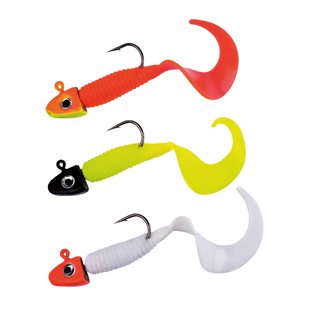 drei Twister wcm, fertig montiert an 2 Gramm Jigkopf, Farben: japanrot, feuergelb und weiß, Länge: 4 cm