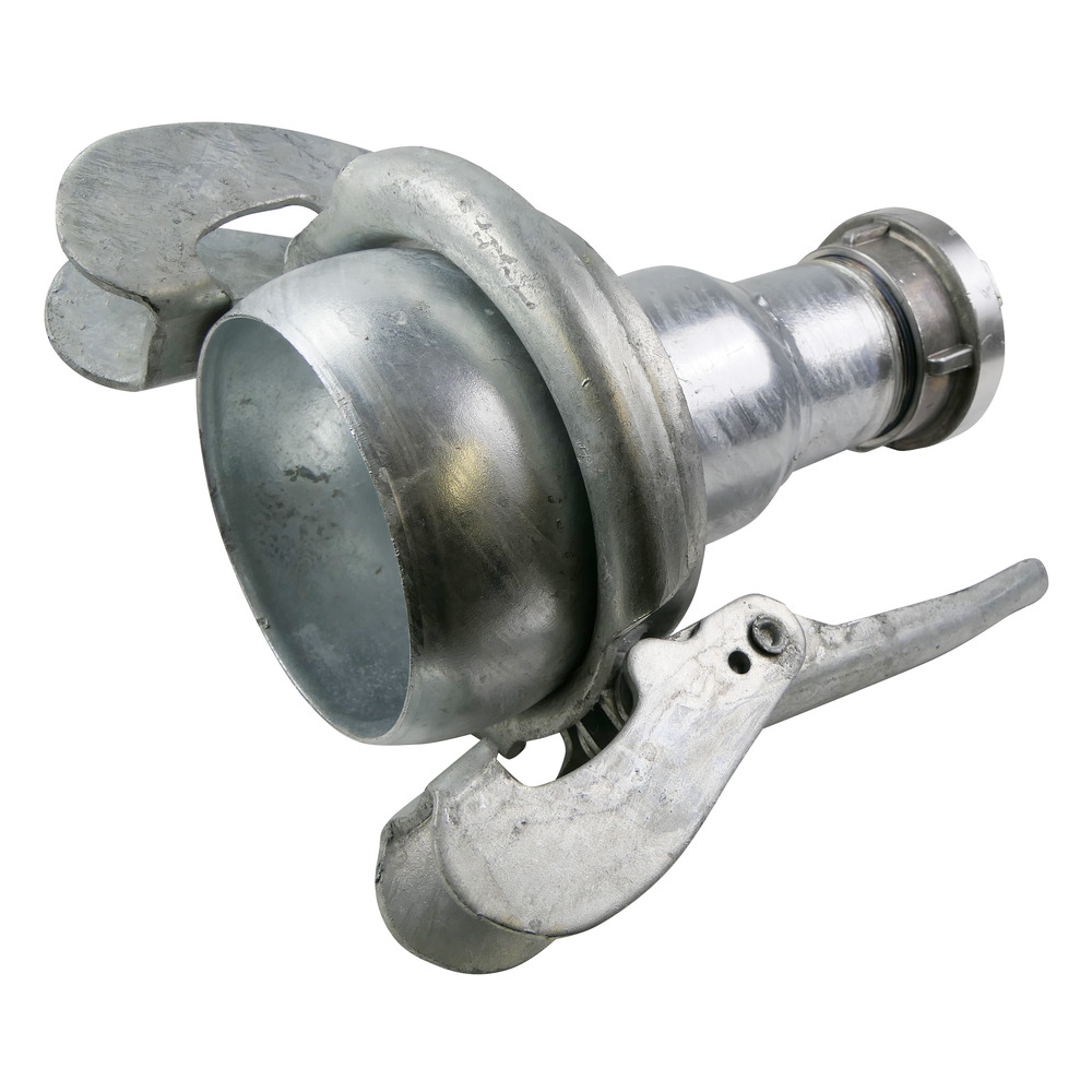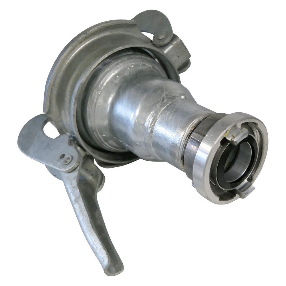 Übergang von KugelSystem Bauer auf Storz-Kupplung. Zum Ankuppeln an Güllefässer von Feuerwehrschläuchen oder Bewässerungsschläuchen mit Storz-Kupplungen an dem vorhandenen Becheranschluss.
