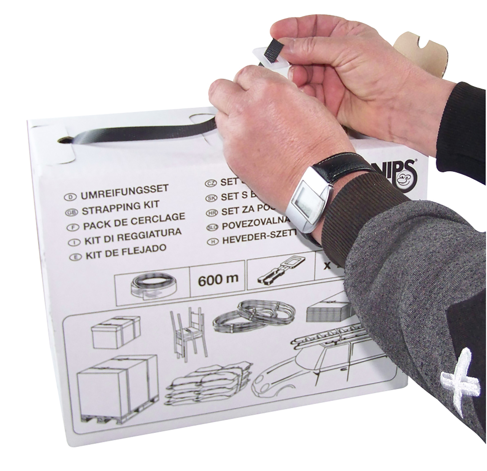 Umreifungsband und Verschlussklammern für sicheres Umreifen stets griffbereit in einer Box
