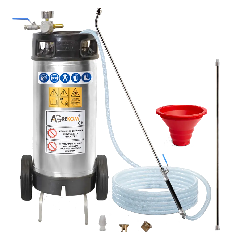 Fahrbarer Behälter aus Edelstahl zum mühelosen Weißeln mit Kalk- oder Innen- und Außenfarbe. Behälterinhalt 19 Liter.Komplette Ausstattung mit Fülltrichter, 10 m Schlauchleitung, Spritzgarnitur mit 2x Flachstrahldüse und Verlängerung (Gesamtlänge 1,6 m)sowie kompletter Wartungseinheit für den Luftanschluss an jeden handelsüblichen Kompressor.Komplett mit Sicherheitsventil, Absperrhahn und Druckminderer zur optimalen Einstellung der Arbeitsdrucks für ein sauberes Spritzbild.Bedienungsanleitung siehe oben bei den downloads