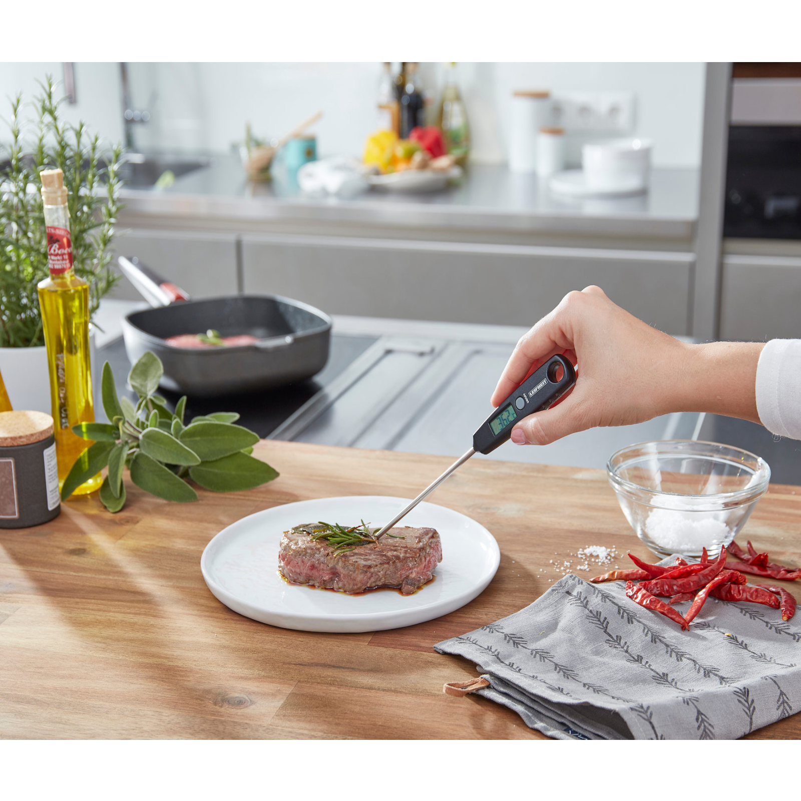 Das digitale Thermometer kann in der Küche vielseitig eingesetzt werden, zum Beispiel als Back- oder Bratenthermometer.