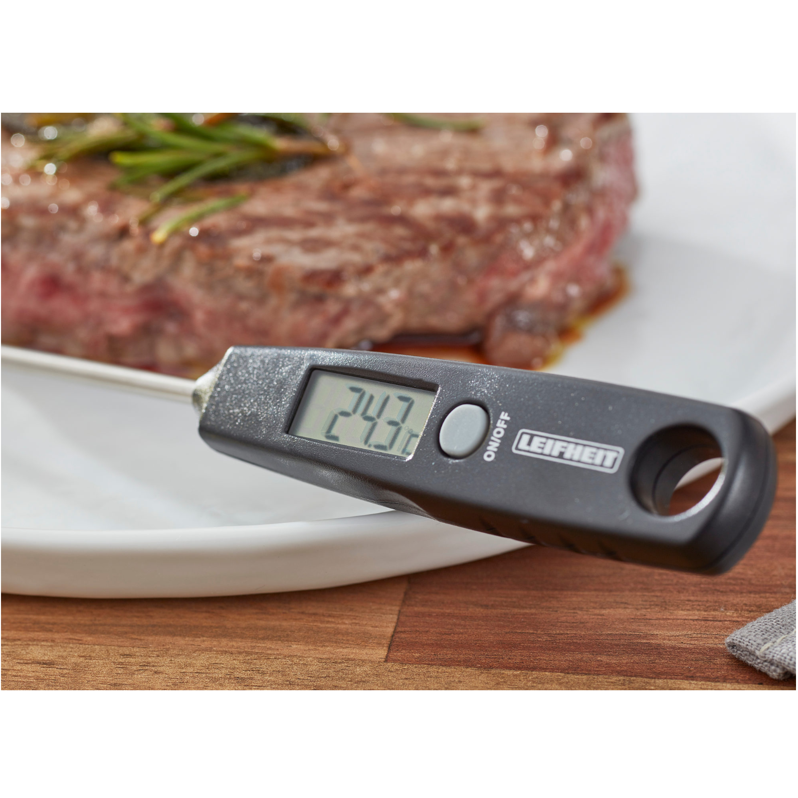 Der Messbereich des digitalen Küchenthermometers von Leifheit liegt zwischen -45 °C und +200 °C.
