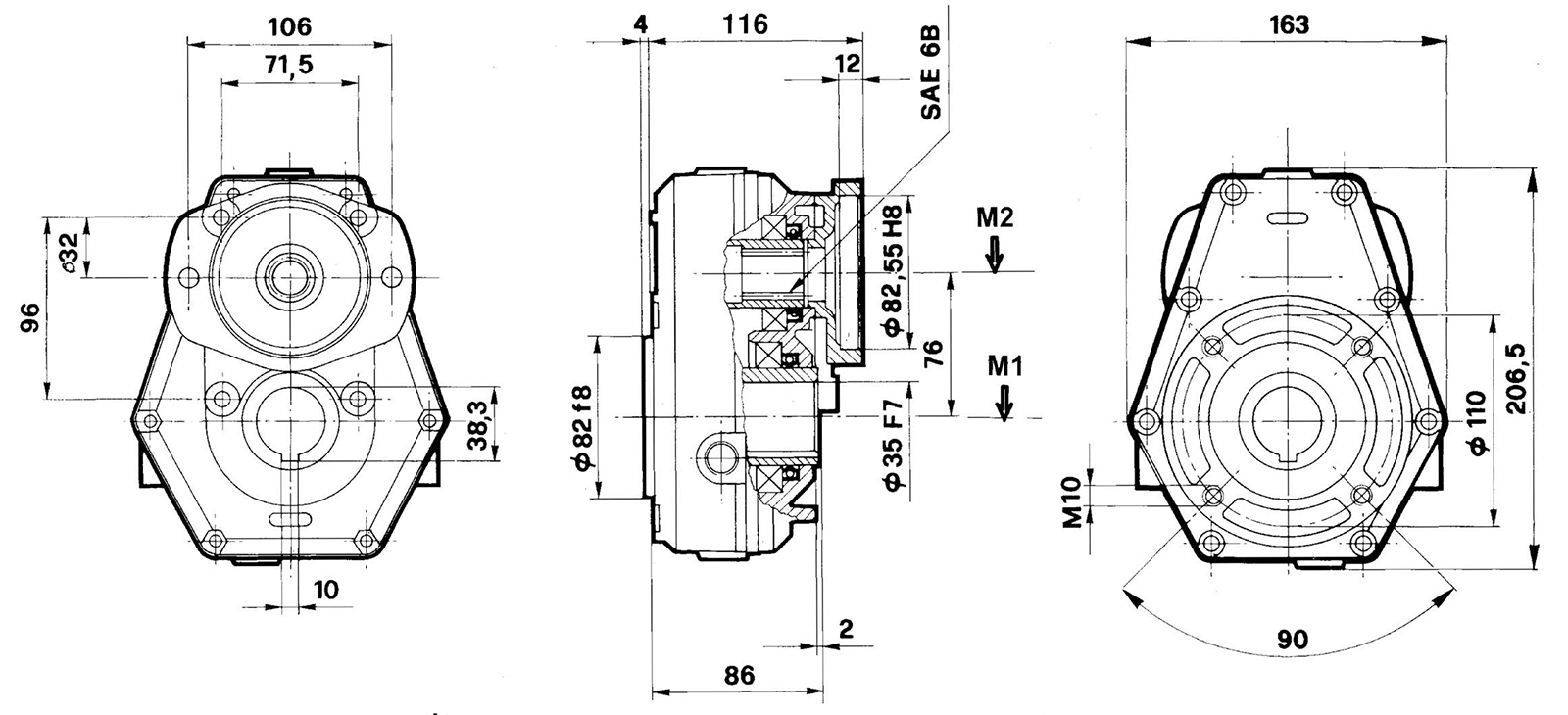 Die Ausgangsseite ist eine Hohlwelle mit 35 mm Durchmesser und einer Keilnut von 10 mm. Zur Befestigung des Getriebes sind auf der Ausgangseite vier M10 Bohrungen mit einem Lochkreisdurchmesser von 110 mm angeordnet.Achtung vor Inbetriebnahme des Getriebes den Ölstand auffüllen und kontrollieren.Die maximale Leistungsübertragung beträgt 10 kW.- Kompakt und robust
