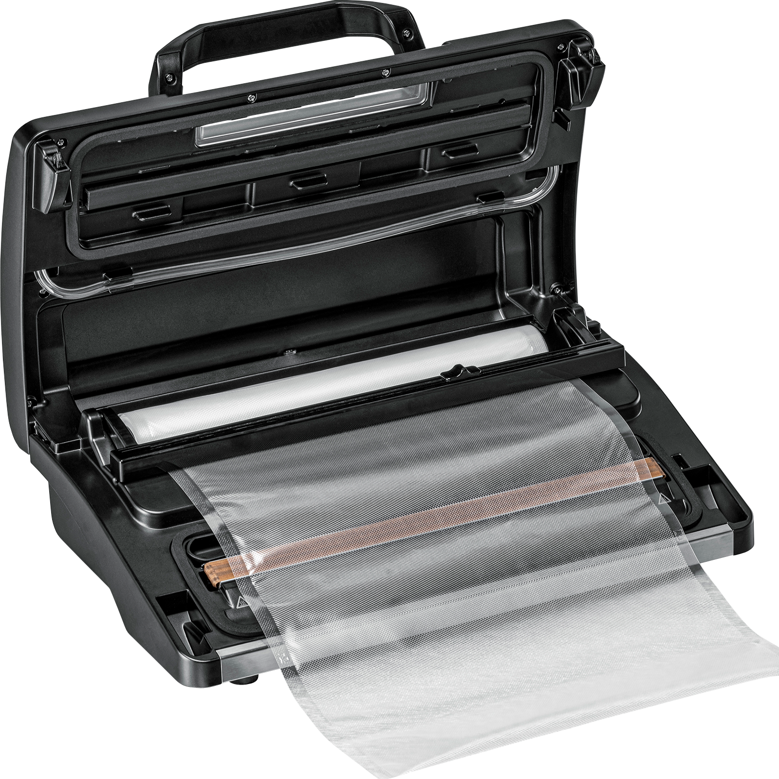DerVAC 585 arbeitet außergewöhnlich schnell und ist auch für den Langzeitbetrieb geeignet.Großeinkäufe oder die Ernte aus dem Garten können ohne Zwischenpausen verarbeitet und sicher verpackt werden. Das integrierte Folienrollenfach mit Sicherheitsmesser sorgt dafür, dass die benötigte Spezialfolie jederzeit griffbereit und präzise zuschneidbar ist. Die leistungsstarke Doppel-Kolbenpumpe entfernt bis zu 97 % der Luft aus den Vakuumbeuteln und versiegelt diese automatisch mit einer stabilen Doppel-Naht – schnell und zuverlässig in nur einem Arbeitsgang.