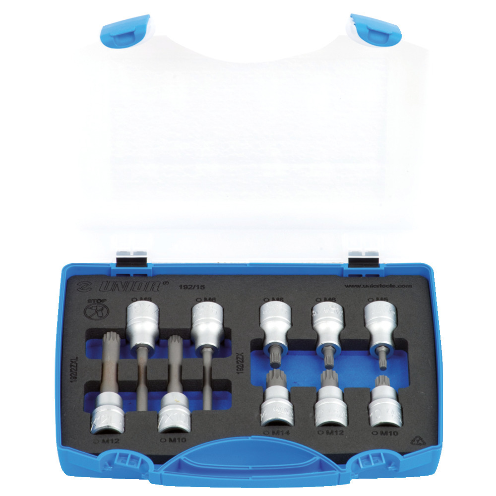 10-teilige 1/2″ Kassette mit je 1 Stk. Vielzahneinsatz M 5, 6, 8, 10, 12 und 14 kurzund M 6, 8, 10 und 12 lang. In Stahlblechkassette.