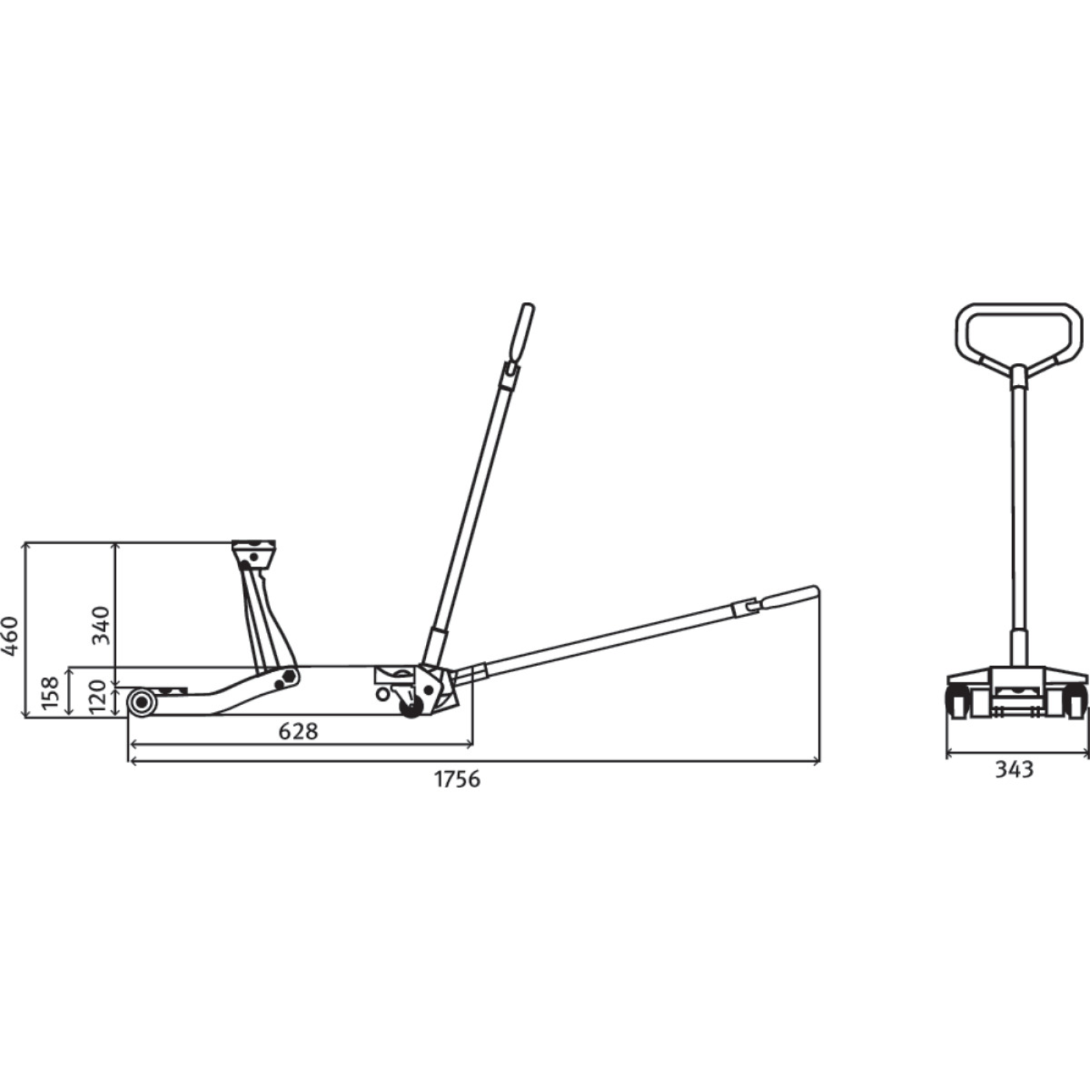 Technische Daten:Tragkraft: 3 t Hub: 340 mmEndhöhe: 460 mm Unterfahrhöhe: min. 120 mmAbmessungen und Gewicht:Länge ca.: 628 mm Breite/Tiefe ca.: 343 mmHöhe ca.: 158 mm Gewicht ca.. 31,5 kgLänge max. ca.: 1756 mm