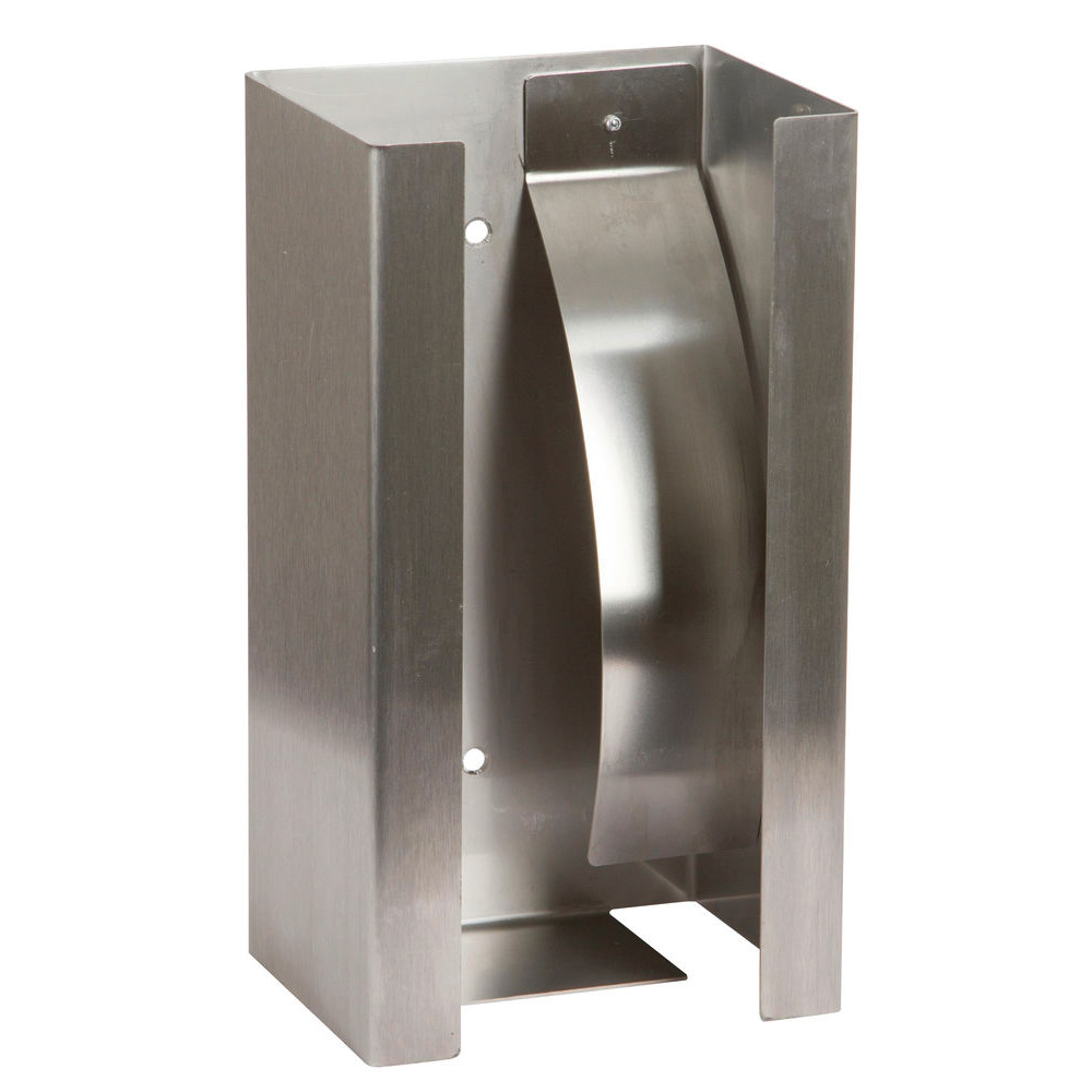 Hygienischer Einmalhandschubox-Halter aus Edelstahl. Die Feder drückt alle Spenderboxen nach vorne und sorgt so für einen festen Sitz im Halter. Die Montage erfolgt durch horizontales oder vertikales anschrauben.24,6 x 13,6 x 10,5 cm (LxHxT)