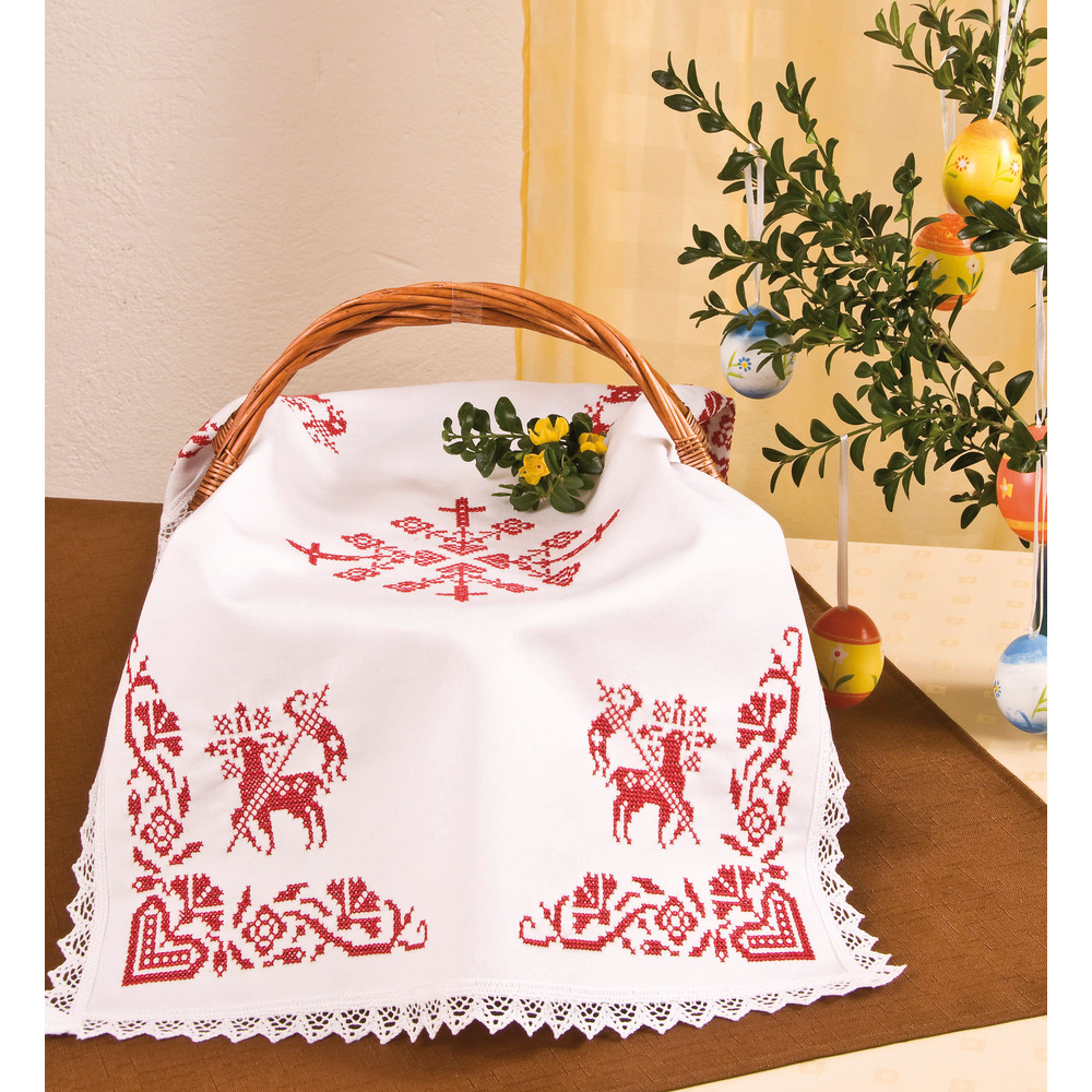 Eine wunderschöne Weihkorbdecke zum Selbersticken – Brauchtum und Handarbeit vereint. Besonders hübsch für Speisen im Körberl oder als Dekoration in Ihrer Bauernstube. Das eingewebte Aidamuster ermöglicht ein einfaches Nachsticken im Kreuzstich.