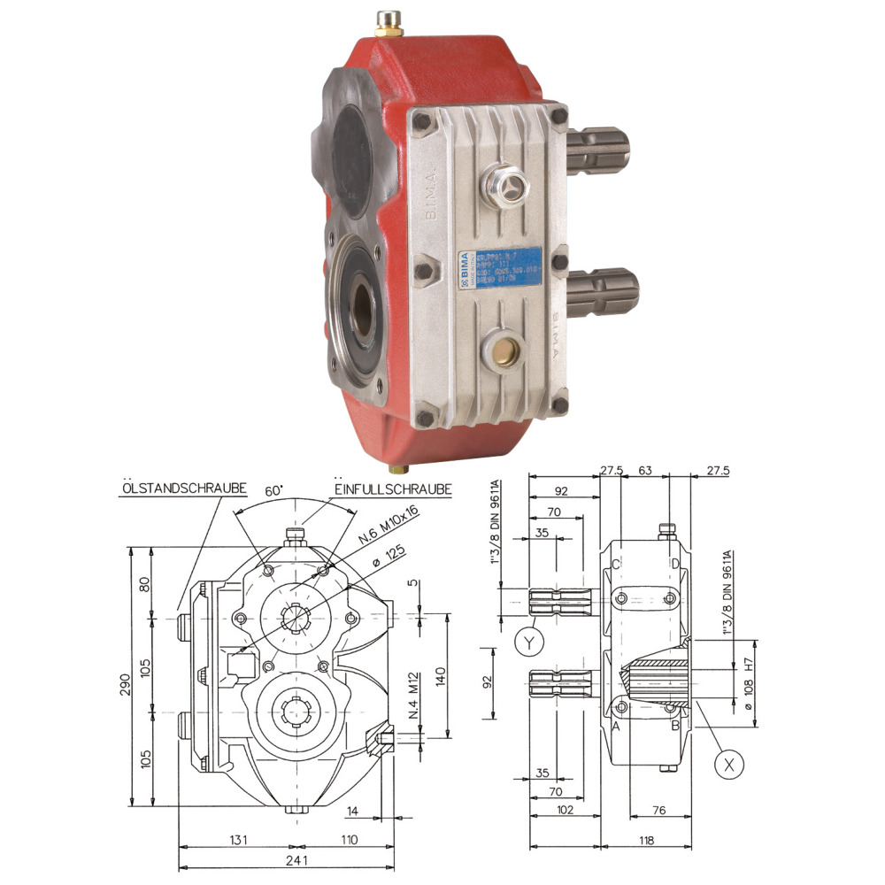 Wende- oder Umkehrgetriebe zur Änderung der Drehrichtung mit Durchtrieb.Eingang Y:540 U/minLeistung: 51,5 kWDrehmoment: 910 NmAnschluss 1 3/8x6DrehrichtungsumkehrMöglichkeit mit Durchtrieb 1:1 (Drehrichtung gleichbleibend).Im allgemeinen führen Drehmomentspitzen bis zum 2-fachen des Nenndrehmoments zu keiner Beschädigung der einzelnen Getriebebauteile. Vollständige Unversehrtheit kann jedoch nur durch eine geeignete Sicherheitsvorrichtung gewährleistet werden.