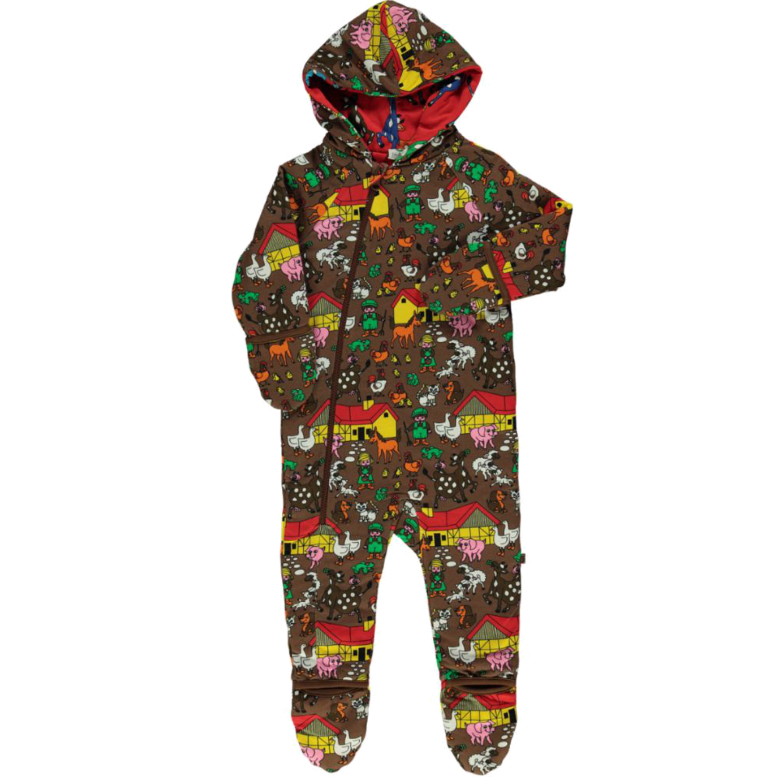 Gefütterter Anzug mit Kapuze aus 100% Bio Baumwolle und Elasthan. Auszuwählen zwischen 2 Designs da wendbar! Händchen und Füßchen klappbar!Wendbarer Anzug mit Bauernhof-Aufdruck. Småfolk ist eine dänische Marke, die Wert auf Qualität legt. Der Hosenanzug wurde in Dänemark entworfen und aus bester 100 % Bio-Baumwolle und Elasthan hergestellt, was das Kleidungsstück dehnbar und weich macht und gleichzeitig die Passform beibehält. So können die Kleinen der Familie in einer farbenfrohen und lebendigen Welt spielen, wachsen und ihre Fantasie erkunden während sie sich gleichzeitig frei bewegen können.