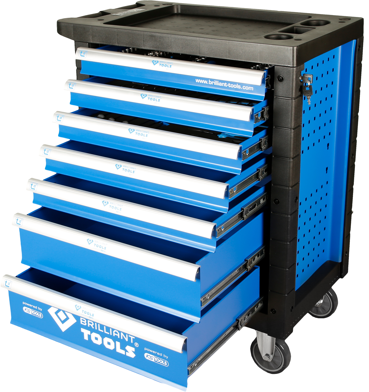 Der Werkstattwagen wird komplett vormontiert und mit drei bestückten Schubladen ausgeliefert. Auspacken – fertig! Damit ist er sofort einsatzbereit.Mithilfe der ergonomischen in die Kunststoffablage integrierten Schiebegriffe lässt er sich ziemlich leicht durch die Werkstatt manövrieren und dabei schützt der Kantenschutz an den Ecken bei Kollisionen.Dank seiner 2 Feststellbremsen an den Lenkrollen bleibt er sicher am Zielort stehen.Der Profi Werkstattwagen ist hochwertig pulverbeschichtet und hat sieben Schubladen. Zwei Schubladen sind besonders hoch und bieten somit auch für Bohrmaschinen und anderen großen Werkzeugen ausreichend Platz. Durch die seitliche Schlüssellochung kann mit den richtigen Halterungen zusätzlicher Stauraum geschaffen werden.Alle Schubladen sind kugelgelagert und auch bei voller Beladung von 35 kg maximale 100% ausziehbar.Damit Ihr Profi Werkstattwagen nicht umkippt sind alle Schubladen einzeln verriegelt und können noch durch das Zentralschloss gesichert werden..Der Profi Werkstattwagen im Detail:Gesamtmaße: B 77 x H 97,5 x T 47 cmSchubladeninnenmaß: 5x 52,8 cm x 39,8 cm x 55 mm2x 52,8 x 39,8 x 13,5 cmGesamttragkraft: 400 kgBelastbarkeit je Schublade: 35 kgVollauszug: JaKugelgelagert: JaVerriegelung: Einzel, Zentral abschließbar: seitlich, 2 SchlüsselKantenschutz: KunststoffRollen: 2 Lenkrollen, 2 BockrollenSchublade 1:Steckschlüssel, 170-teilig:mit 6,3 mm (1/4 Zoll) Antrieb:-je 1 Sechskant-Stecknuss 4, 4.5, 5, 5.5, 6, 7, 8, 9, 10, 11, 12, 13, 14 mm-je 1 Sechskant-Stecknuss, extra lang 4, 5, 6, 7, 8, 9, 10 mm-je 1 Torx-E-Stecknuss E4, E5, E6, E7, E8-je 1 Bit-Stecknuss, T-Profil T8, T9, T10, T15, T20, T25, T27, T30-je 1 Bit-Stecknuss, T-Profil mit Stirnlochbohrung TB8, TB9, TB10, TB15, TB20, TB25, TB27, TB30-je 1 Bit-Stecknuss, Pozidriv PZ0, PZ1, PZ2-je 1 Bit-Stecknuss, Innensechskant 3, 4, 5, 6 mm-je 1 Bit-Stecknuss, Schlitz 4, 5.5, 6.5, 7 mm-je 1 Bit-Stecknuss, Kreuz PH0, PH1, PH2-je 1 Verlängerung in 50 und 10 cm-1 Kardangelenk-1 Drehgriff 15 cm-1 1/4 Zoll-Umschaltknarre 14,5 cm, 72 Zähne feinverzahnt-1 Gleitgriff 11 cmmit 10 mm (3/8 Zoll) Antrieb:-je 1 Sechskant-Stecknuss 10, 11, 12, 13, 14, 15, 16, 17, 18, 19 mm-je 1 Sechskant-Stecknuss, extra lang 10, 11, 12, 13, 14, 15 mm-je 1 Torx-E-Stecknuss E10, E11, E12, E14, E16, E18-1 Verlängerung 12,5 cm-1 3/8“-Umschaltknarre 20,5 cm, 72 Zähne feinverzahnt-1 Zündkerzen-Stecknuss 18 mm-1 Adapter für 8 mm Bits-1 Kardangelenkmit 12,5 mm (1/2 Zoll) Antrieb:-je 1 Sechskant-Stecknuss 10, 11, 12, 13, 14, 15, 16, 17, 18, 19, 20, 21, 22, 24, 27, 30, 32 mm-je 1 Sechskant-Stecknuss, extra lang 16, 17, 18, 19, 22 mm-je 1 Torx-E-Stecknuss E20, E24-je 1 Zündkerzen-Stecknuss 16, 21 mm-1 Drehgriff 25 cm-1 Verlängerung 12,5 cm-1 1/2 Zoll-Umschaltknarre 25 cm, 72 Zähne feinverzahnt-1 Kardangelenk-1 Adapter für 8 mm Bits-Bits in 8 mm Antrieb x 30 mm Länge:-je 1 Bit, Torx mit Stirnlochbohrung TB40, TB45, TB50, TB55, TB60, TB70-je 1 Bit, Torx T40, T45, T50, T55, T60, T70-je 1 Bit, Innensechskant 7, 8, 10, 12, 14 mm-je 1 Bit, Kreuz PH3, PH4-je 1 Bit, Schlitz 8, 10, 12 mm-je 1 Bit, Pozidriv PZ3, PZ4-je 1 Innensechskantschlüssel 1.27, 1.5, 2, 2.5, 3, 4, 5 mm-Bits in 6,3 mm (1/4 Zoll) Antrieb x 25 mm Länge:-je 1 Bit, Vielzahn M5, M6, M8-je 1 Bit, T-Profil T5, T6, T7-je 1 Bit, RIBE-Profil M5, M6, M7, M8, M9-je 1 Bit, Fünfstern TS10, 15, 20, 25, 27, 30, 40, 45-1 Bit, T-Profil mit Stirnlochbohrung TB7Schublade 2:Schraubenschlüssel, 24-teilig:-16 Ringmaulschlüssel: 6, 7, 8, 9, 10, 11, 12, 13, 14, 15, 16, 17, 18, 19, 21, 22 mm-8 Ringschlüssel gekröpft: 6x7, 8x9, 10x11, 12x13, 14x15, 16x17, 18x19, 20x22 mmSchublade 3:Zangen und Schraubendreher, 13-teilig:-5 Schraubendreher, Schlitz: 2,0x63 mm, 3,0x80 mm, 4,0x10 cm, 5,5x12,5 cm, 6,5x15 cm-3 Schraubendreher, Philips: PH0x75 mm, PH1x80 mm, PH2x10 cm, PH3x15 cm-1 Profi-Kombizange: 18 cm-1 Profi-Seitenschneider: 18 cm-1 Profi-Telefonzange, gerade: 20 cm-1 Profi-Wasserpumpenzange: 25 cm