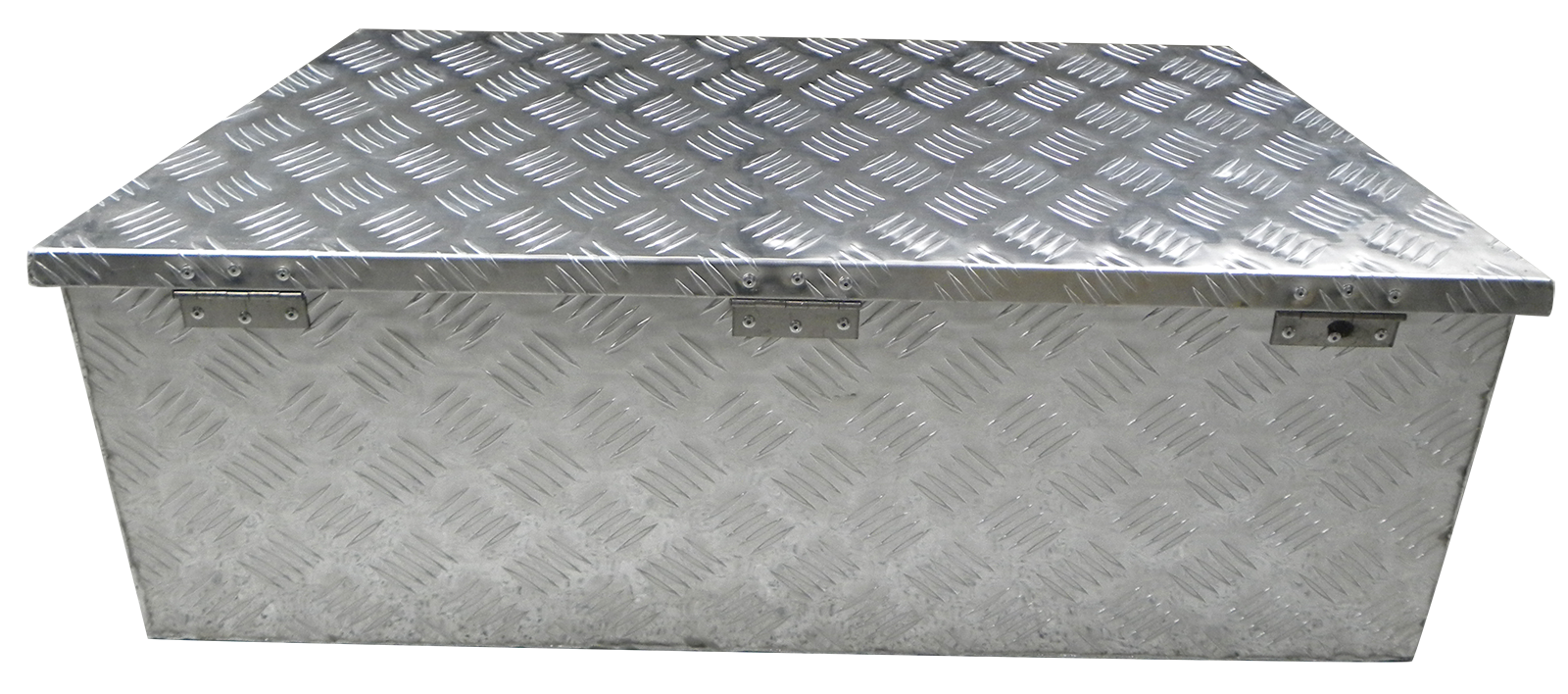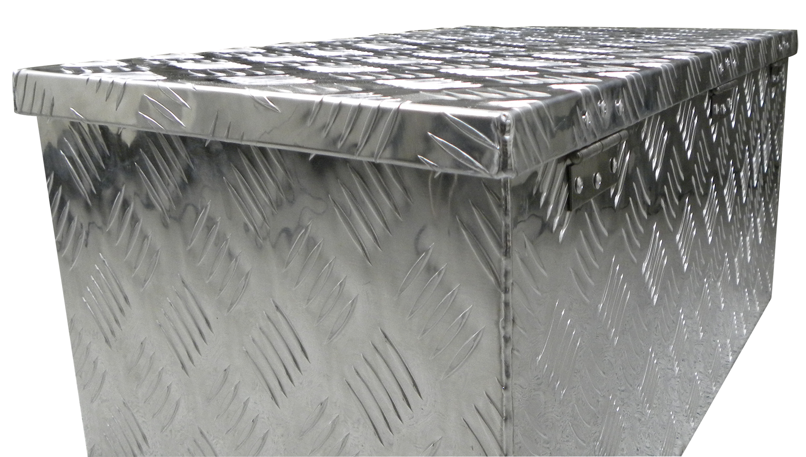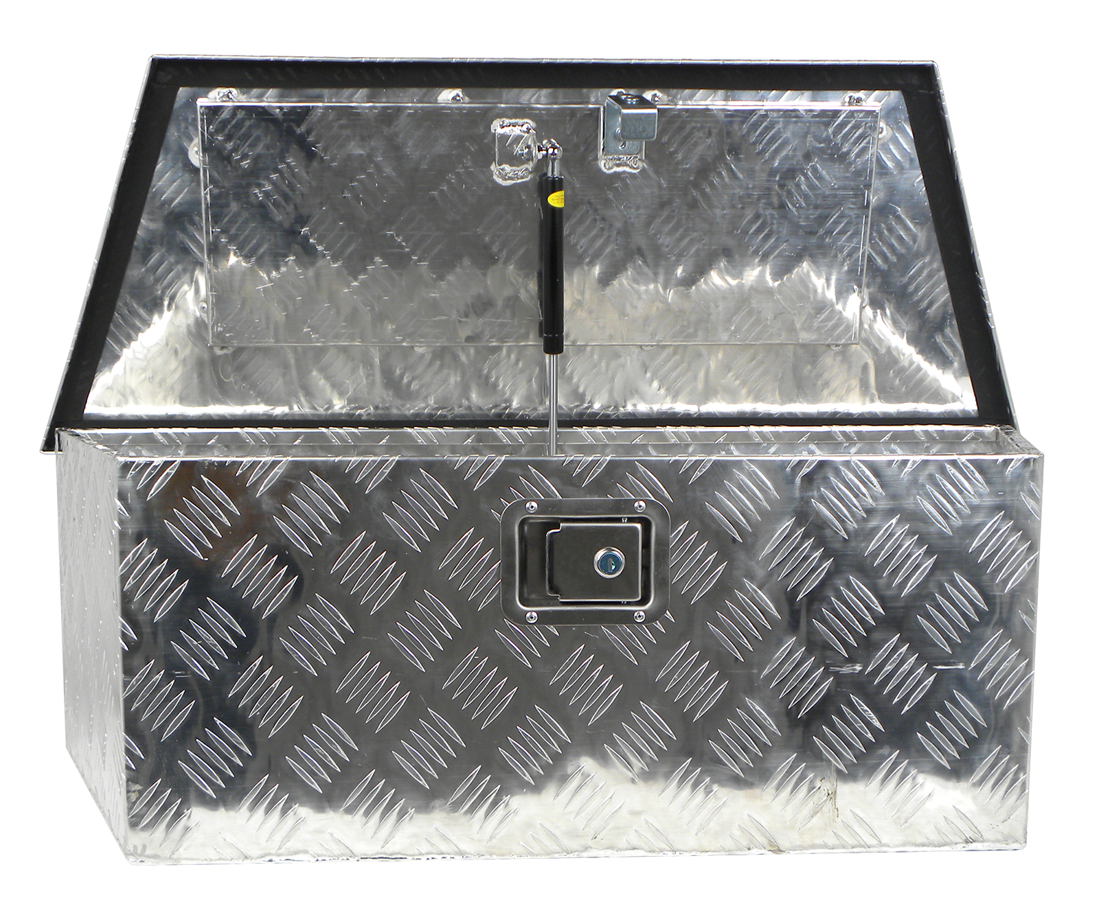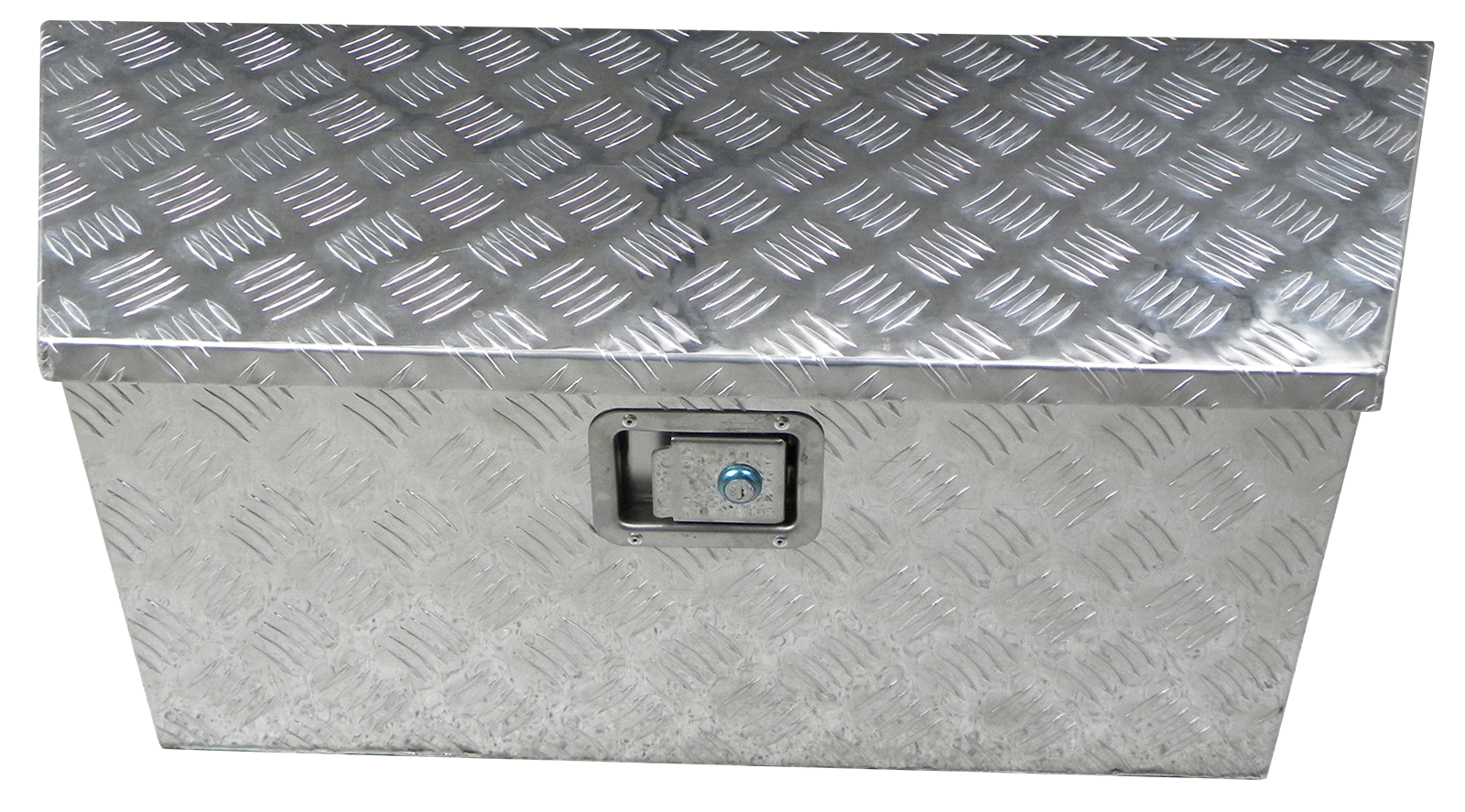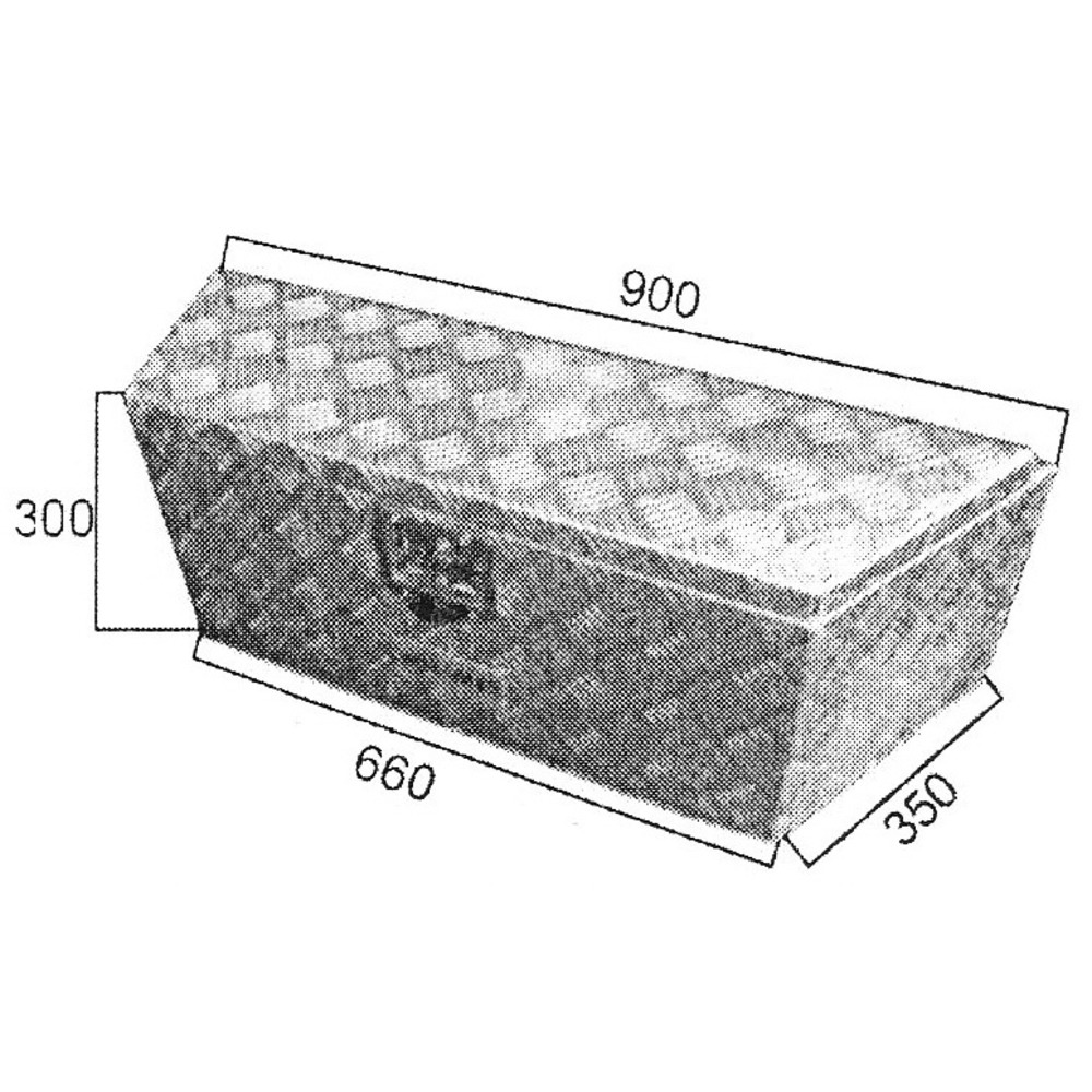 Stabiler Werkzeugkasten aus Alu mit integriertem Schloss, 2 Schlüssel, Deckeldichtung und Gasdämpfer, Maße: Breite 660 mm vorne, 900 mm hinten, Höhe 300 mm, Tiefe 350 mm.
