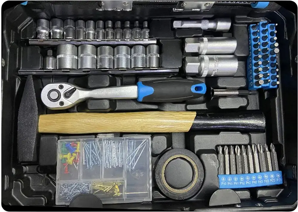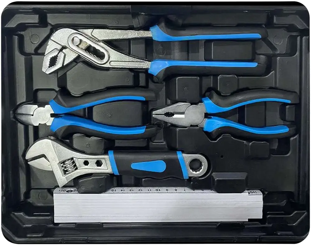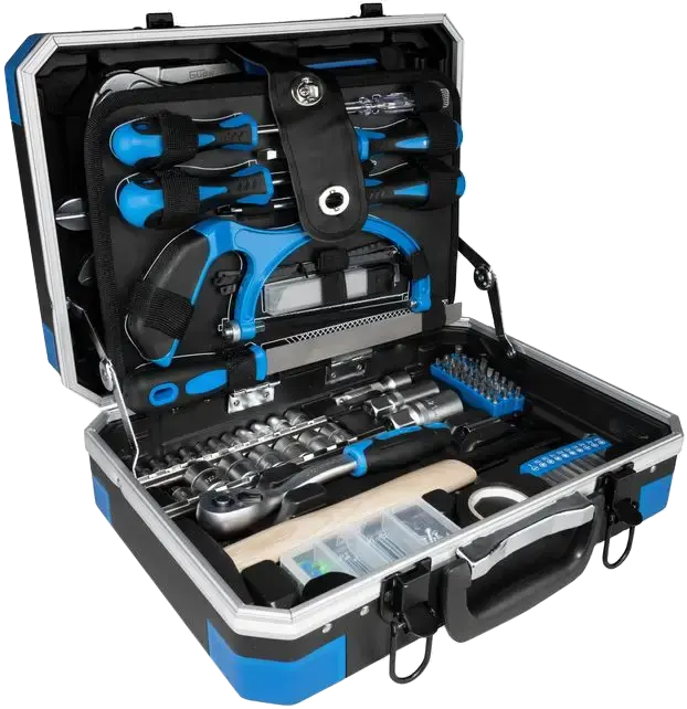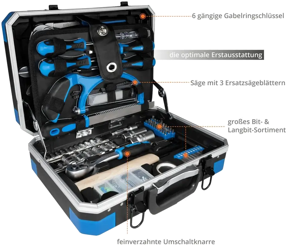 Ein handlicher Werkzeugkoffer der die perfekte Grund- bzw. Erstausstattung beinhaltet.Dieses 241-teilige Werkzeugset aus Chrom-Vanadium- und Carbon-Stahl reicht vom klassischen Schraubendreher-Sortiment, über eine Ratsche mit diversen Steckschlüsseln, mehrere Zangen und Gabelringschlüssel bis hin zur Säge und einem großen Bit-Sortiment inklusive Langbits.Wasserwaage, Meterstab, Hammer & Co fehlen natürlich auch nicht.Desweiteren beinhaltet der Koffer eine praktisch sortierte Box mit diversen Befestigungsmitteln wie Nägeln und Schrauben.Inhalt: