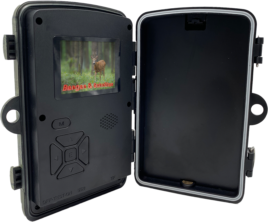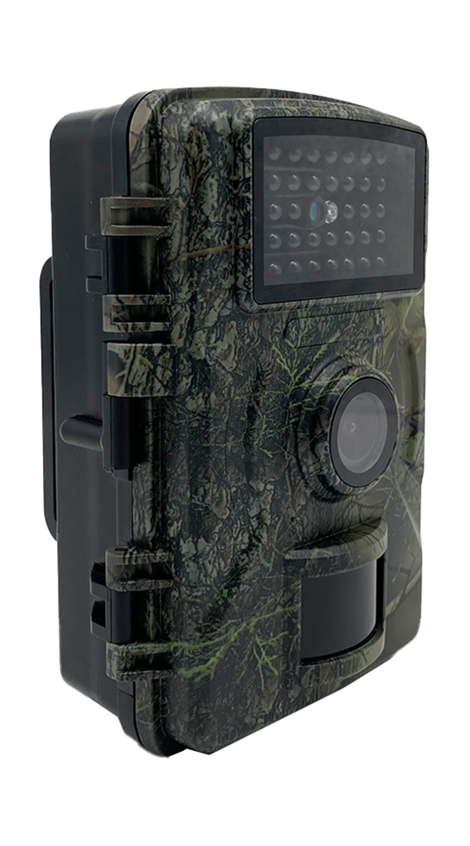 Kleine 16 Mega-Pixel Full HD Überwachungskamera mit 38 BLACK-LEDs und 2″ TFT Bildschirm, Blitz mit 20 m Reichweite, PIR Bewegungsmelder bis 10 m, Aufnahme als Foto einstellbar 1 - 3 fache Serienaufnahme, Einzelbild + Video oder nur Video (10 sec. bis 3 min. wählbar, mit Tonaufnahme) in Farbe und nachts in schwarz/weiß, Trigger Time nur 0,7 Sek. (bei 4 GB Micro SD Karte), Objektivwinkel 90°, automatischer Weißabgleich, Aufnahmen mit Datum, Uhrzeit, Mondphase und Temperatur, Passwortschutz, Kartenschacht für TF Karten bis 32 GB (nicht im Lieferumfang), Betrieb über 8 AA Batterien (nicht im Lieferumfang), wetterfestes Gehäuse IP66 mit Gurtband, Maße L x B x H: 135 x 95 x 65 mm, Gewicht: 360 g.