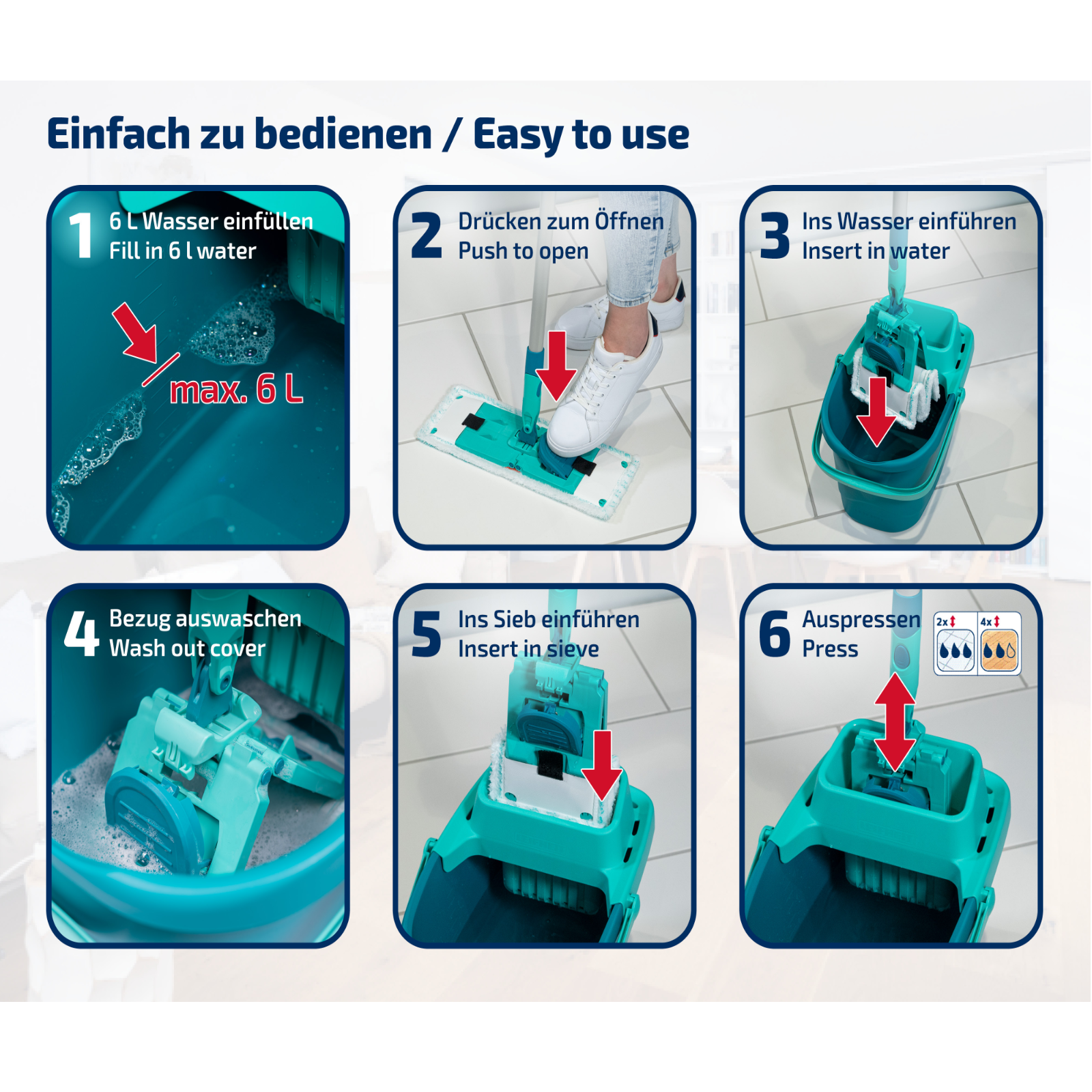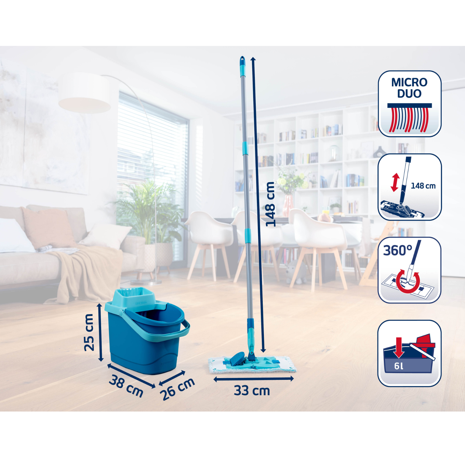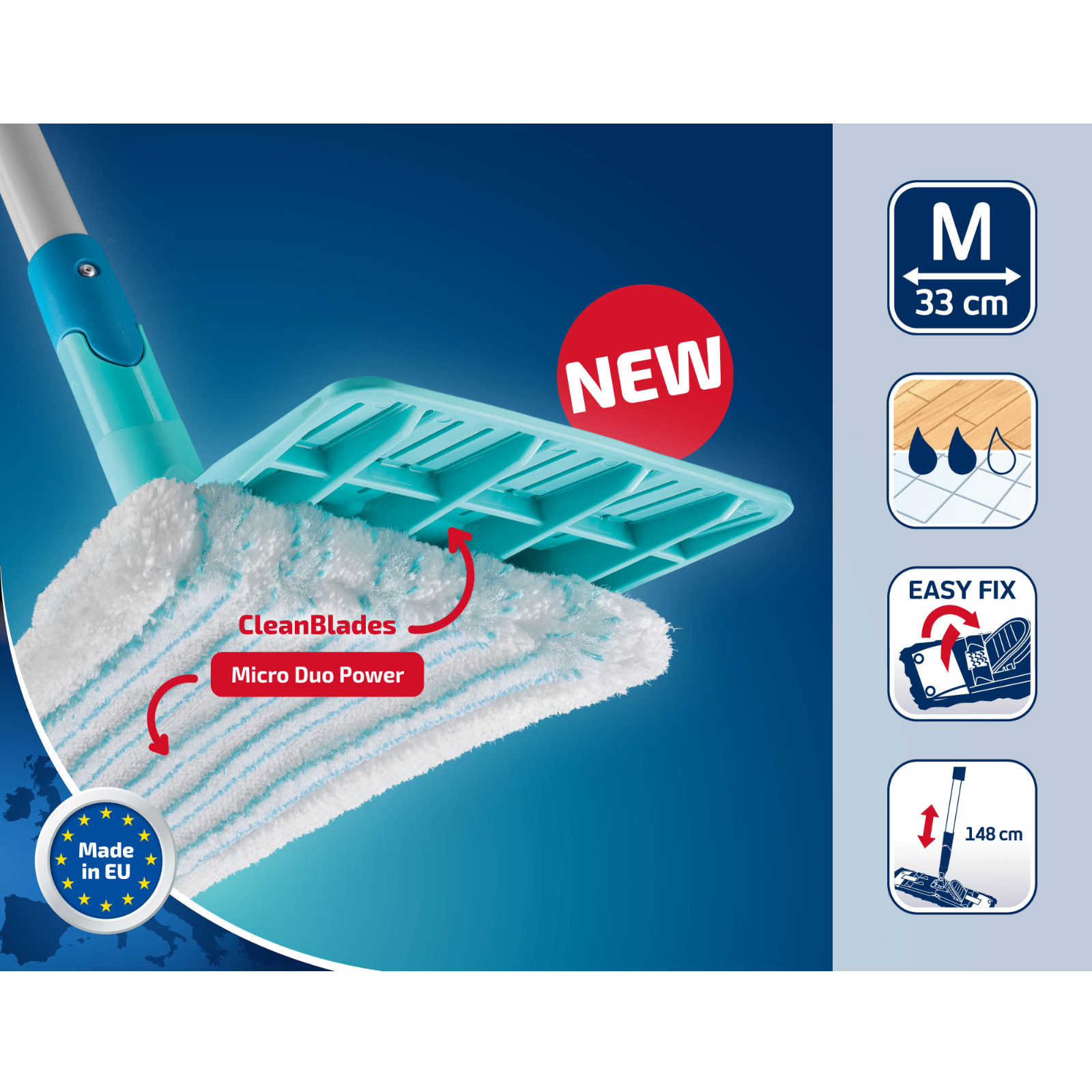 Wischbezug micro duo für das Set CLEAN TWIST M ergo/Power Clean MLanglebiger und nachhaltiger Wischbezug: micro duo bei 60 °C bis zu 200x in der Waschmaschine waschbarReinigungsstarkes 2-Faser-System aus Microfaser mit leicht erhöhten Borsten für die gründliche Reinigung aller BodenartenBesonders hohe Aufnahme von Schmutz und SchmutzwasserTaschen-Klettkombination für einfaches Anbringen und Entfernen des Bezugs, bei gleichzeitig sicherem Halt während des AusschleudernsWischbreite: 33 cm
