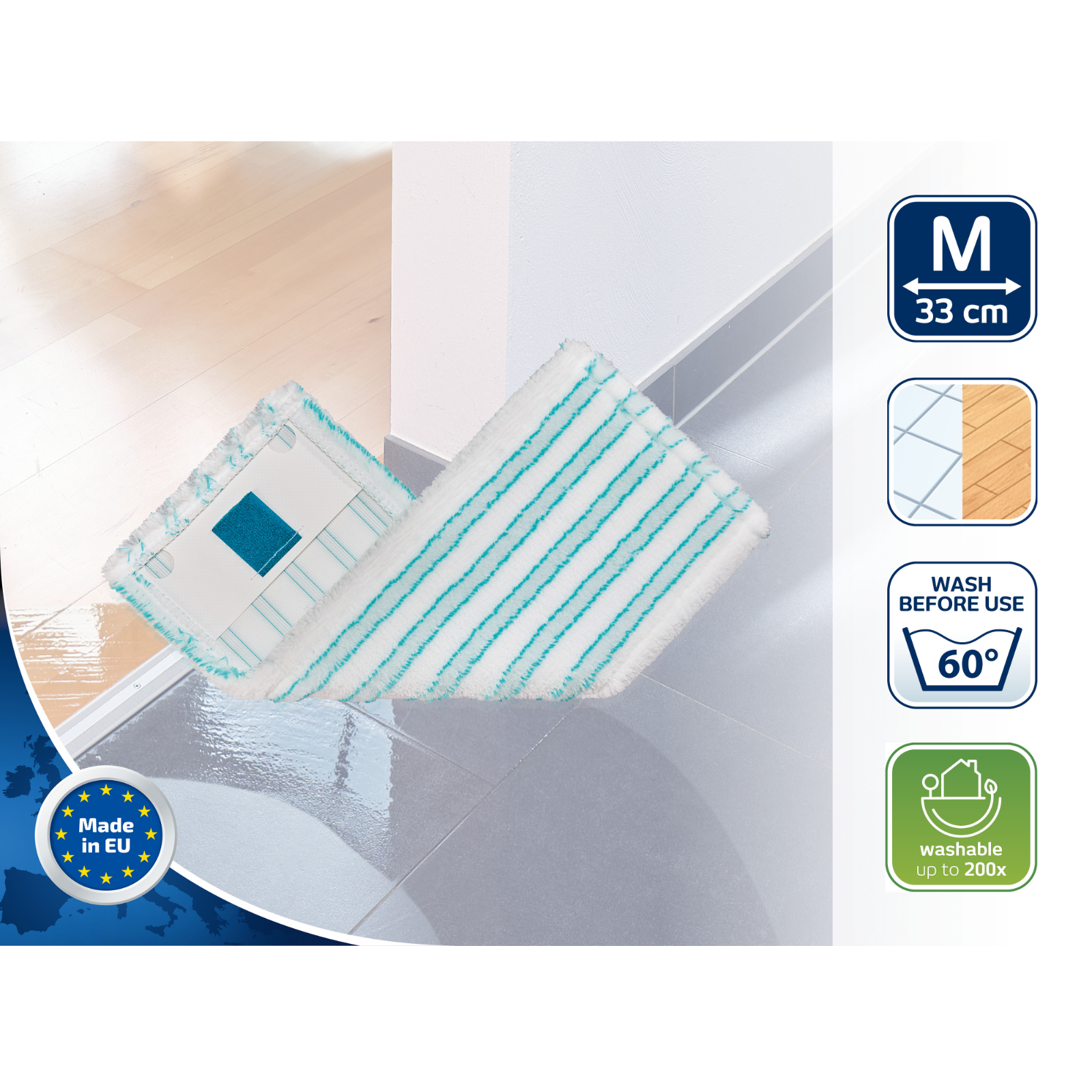 • Reinigungsstarkes 2-Faser-System aus Microfaser mit leicht erhöhten Borsten für die gründliche Reinigung aller Bodenarten