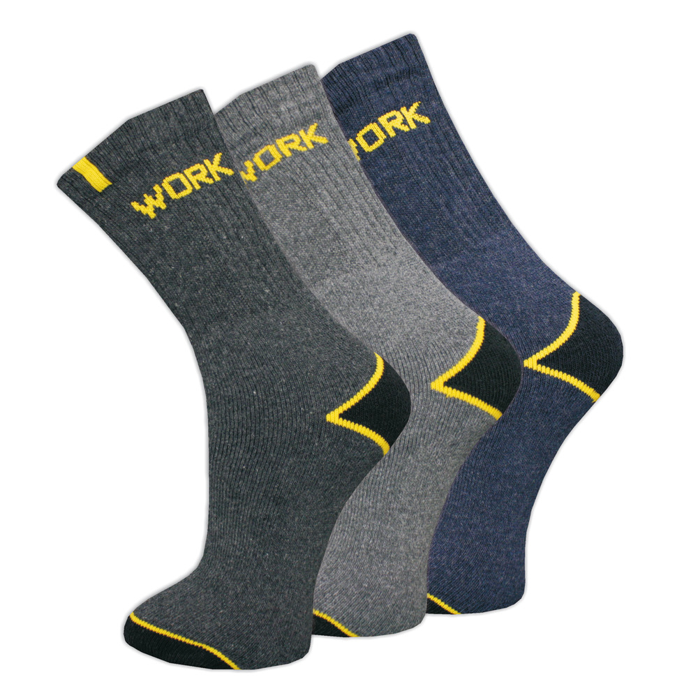 3er-Pack Worker Socken mit doppelt elastischem Bündchen sowie Verstärkung im Fersen- und Zehenbereich. Optimales Fußklima und Feuchtigkeitstransport durch Baumwoll-Polyestermischung. Geprüft nach Öko-Tex® Standard 100. Material: 65% Baumwolle, 30% Polyester, 5% sonstige Fasern. Größe: 39/42, 43/46