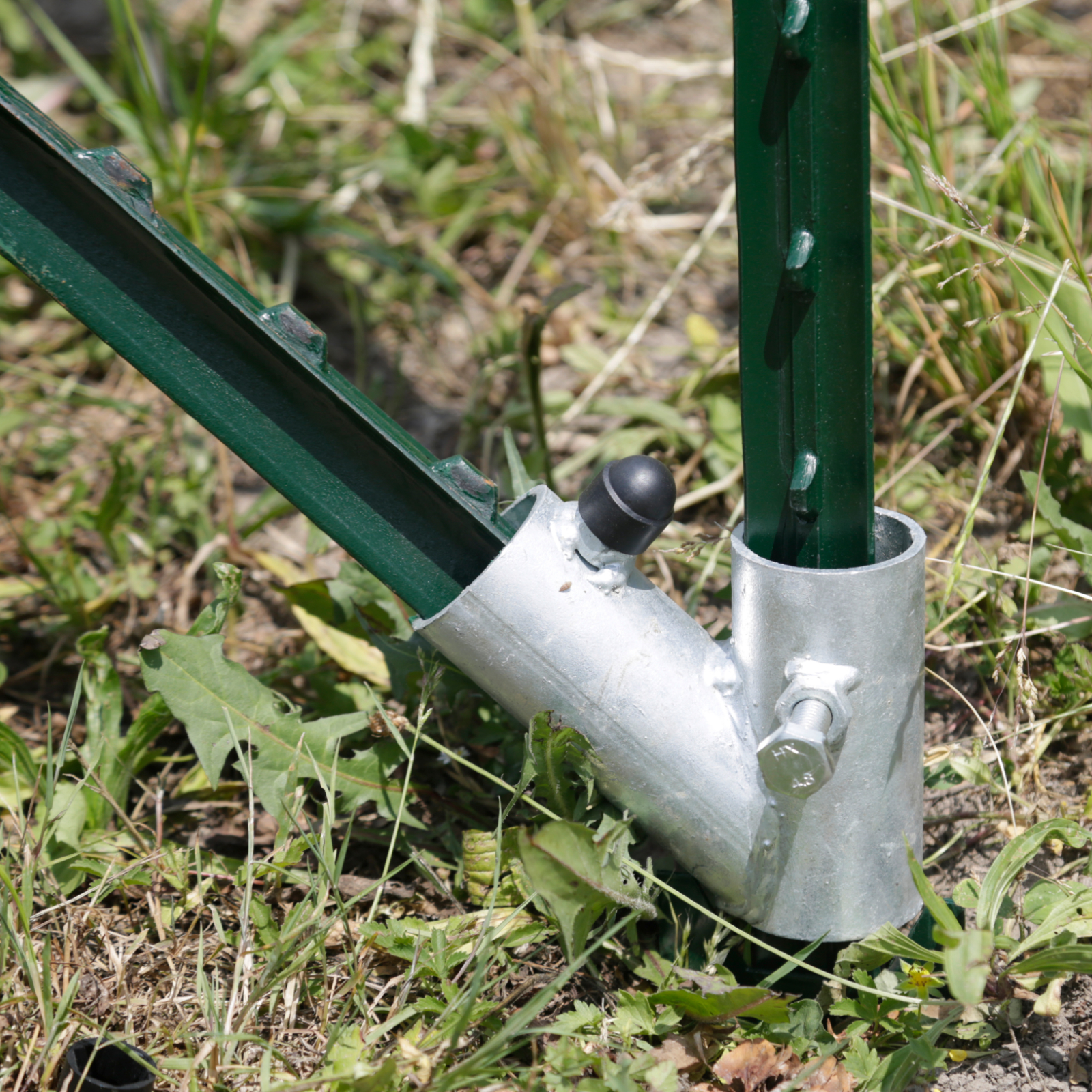 • Bringen Sie den diagonalen Stützpfahl in der Hülse an und richten ihn aus!