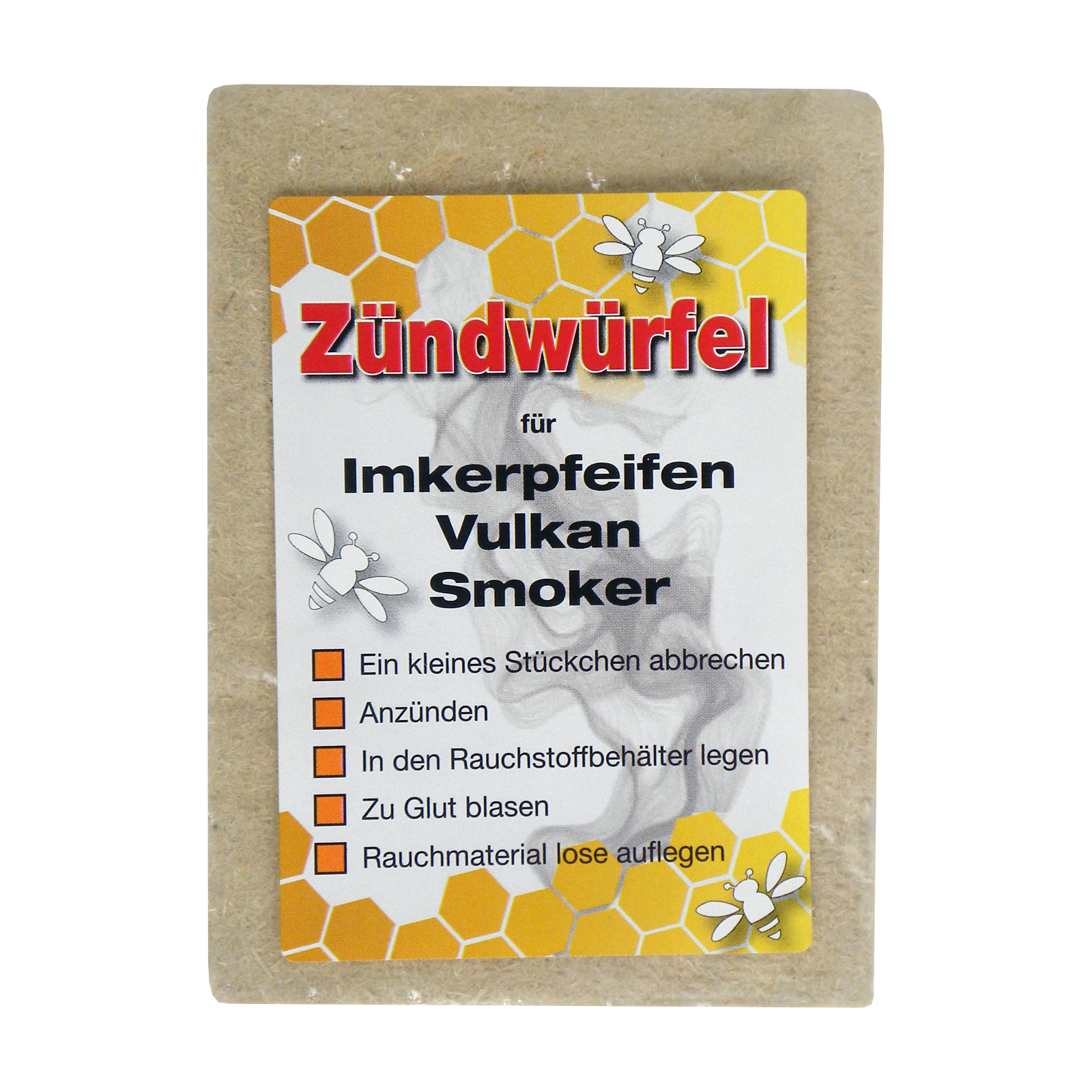 Bewährte Anzündhilfe für Smoker und Imkerpfeifen. Einfach ein Stück abbrechen, anzünden und das Rauchmaterial darüber schütten.