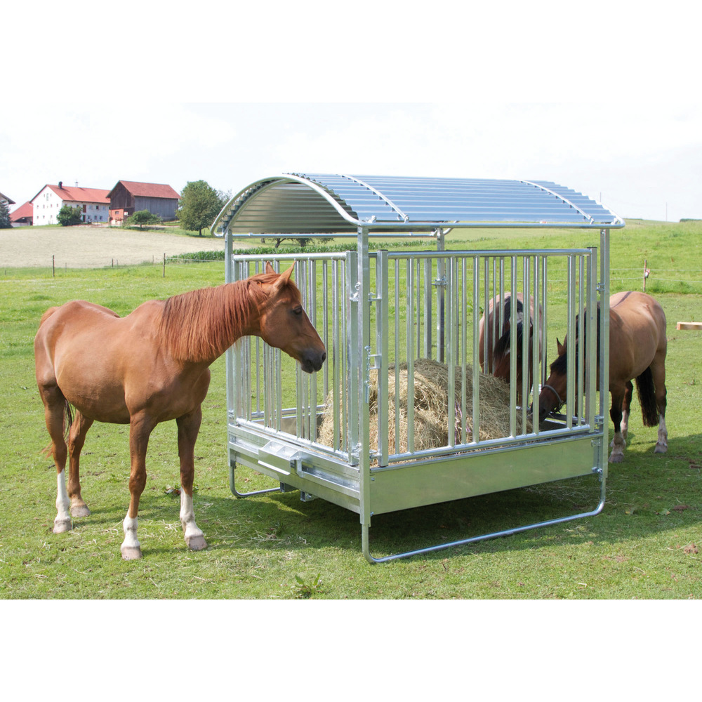 Pour faciliter le remplissage du râtelier à foin, 2 côtés peuvent être ouverts, les glissières sont réglables en hauteur (adaptation à la taille de l'animal !).