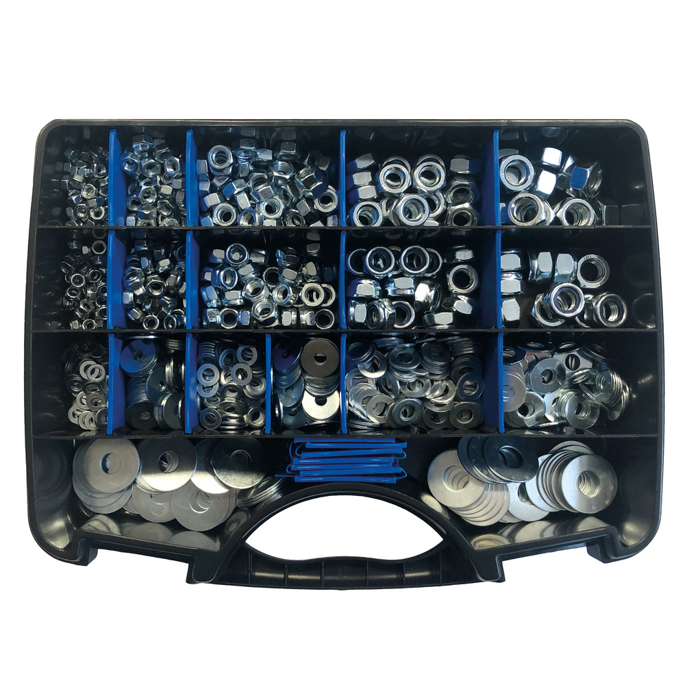 Jeu complet et de haute qualité comprenant tous les écrous et rondelles courants, en version galvanisée. Livré dans une mallette de transport robuste, avec séparateurs - pas de mélange des différentes tailles ! Contenu : Écrou hexagonal DIN 934 : M5 / M6 / M8 / M10 / M12 Écrou de sécurité DIN 985 : M5 / M6 / M8 / M10 / M12 Rondelle DIN 125 M5 / M6 / M8 Rondelles corps : 5x20 / 6x20 / 8x20 / 10x30 / 13x30