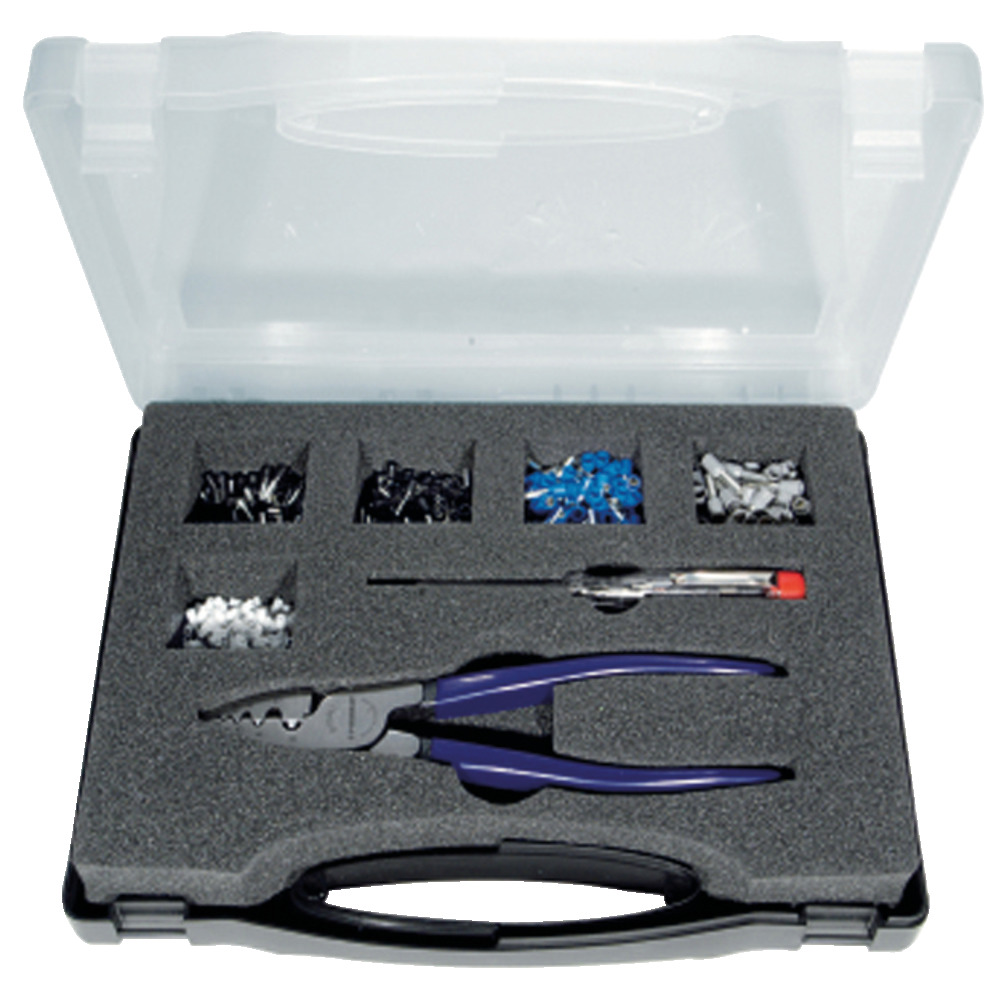 Contenu : 1 pince à embouts de fil 180 mm pour embouts de fil 0,25 - 16 mm², 1 testeur de phase 150 mm, 100 embouts de fil non isolés 0,5/0,75/1,5/2,5 et 4,0 mm².