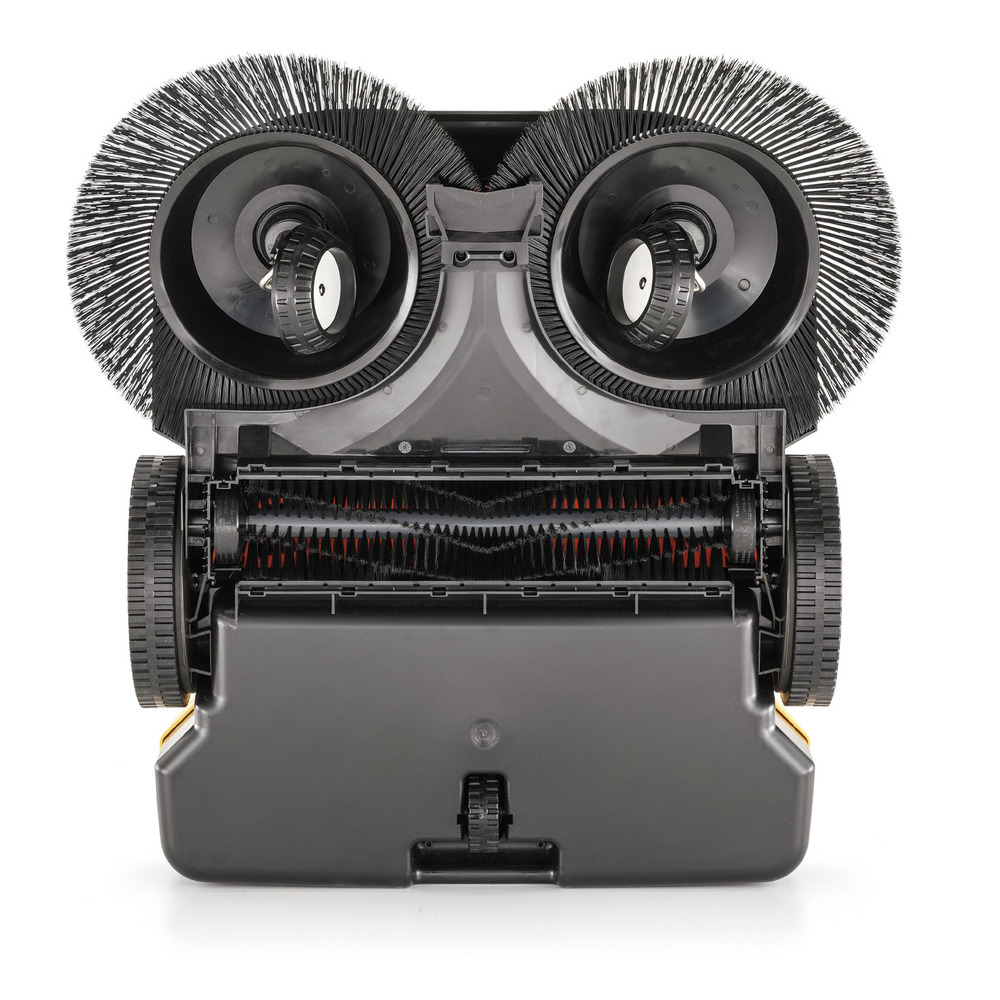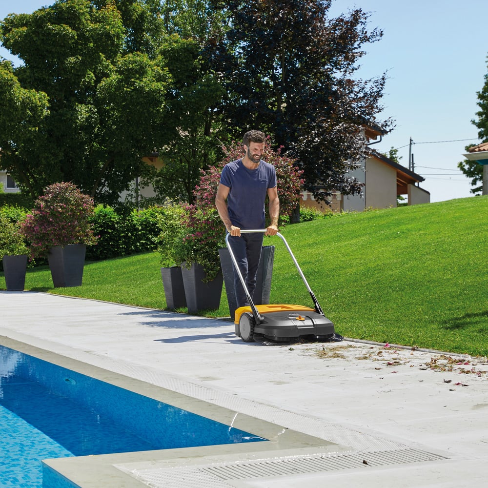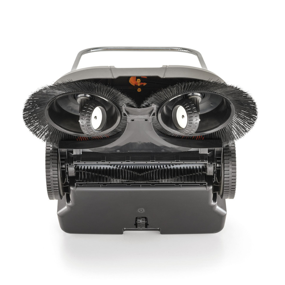 Balayeuse maniable sans entraînement pour une utilisation en extérieur. Deux brosses rotatives contrarotatives d'un diamètre de 41 cm chacune et un bac à poussière de 50 litres. Données techniques :