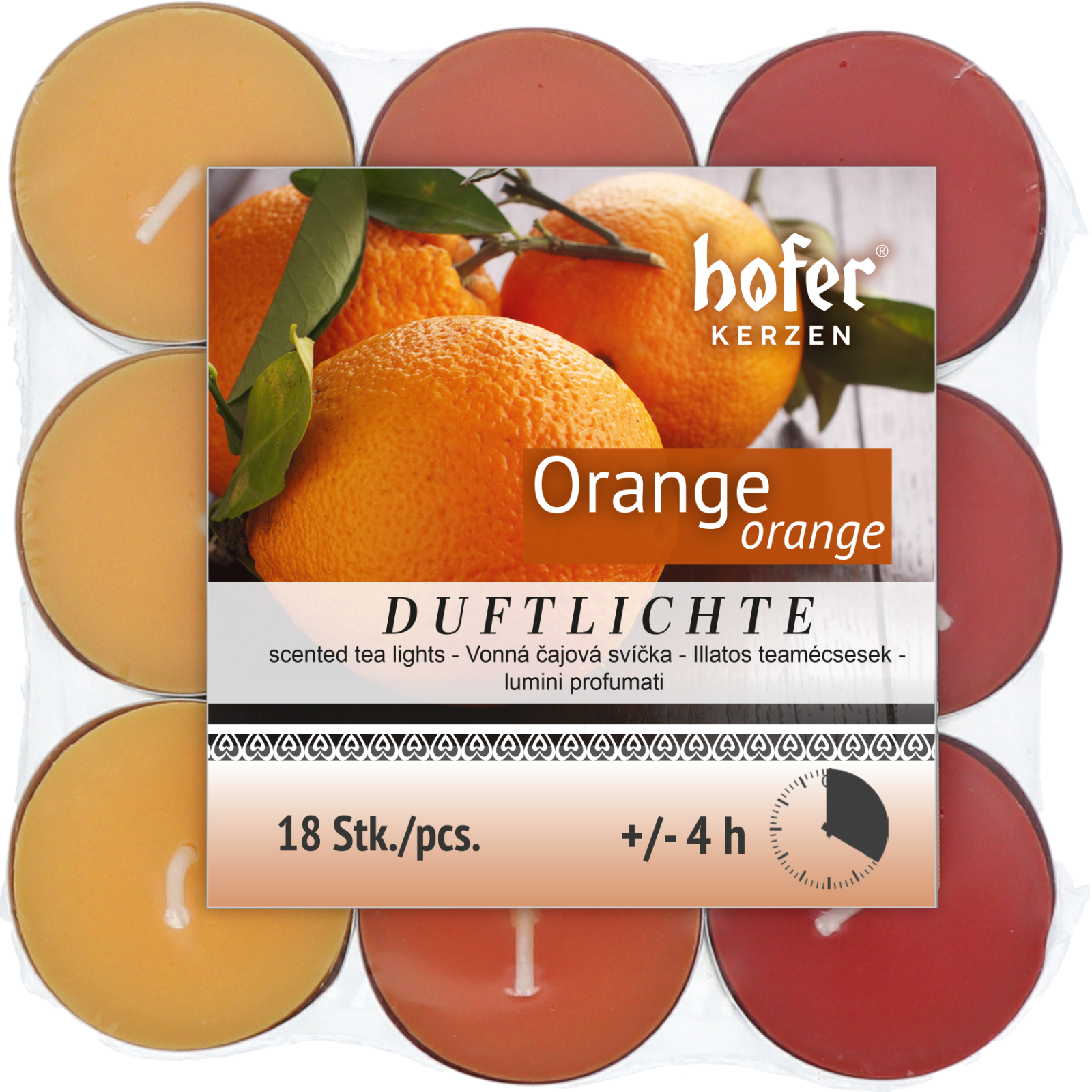 Ce coffret économique apporte une touche de confort à votre intérieur : 18 bougies chauffe-plat parfumées Hofer, avec leur boîtier métallique, remplies de cire de haute qualité et d'un délicat parfum d'orange.