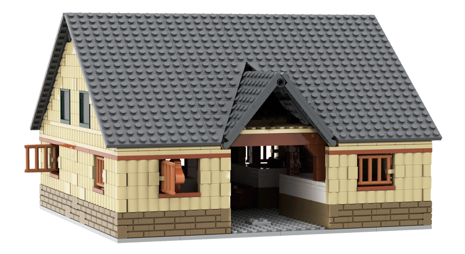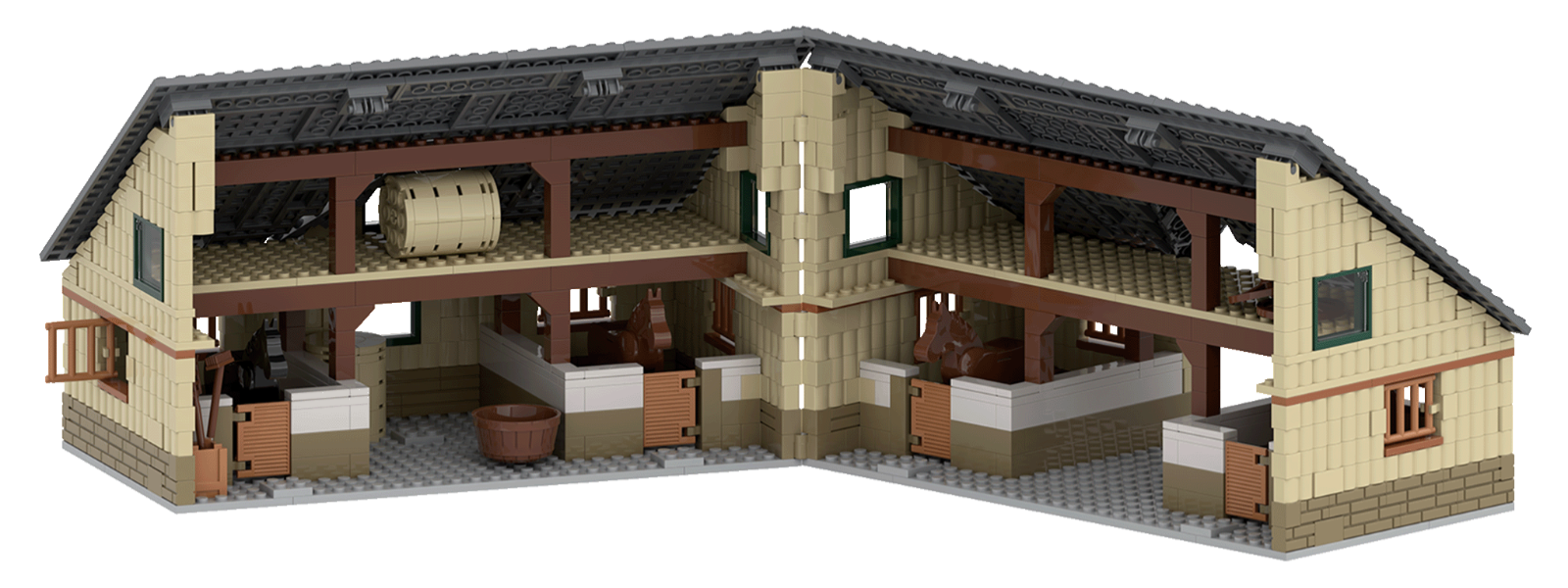 Construisez une grange détaillée avec un toit articulé et quatre boxes séparés grâce à 805 briques.