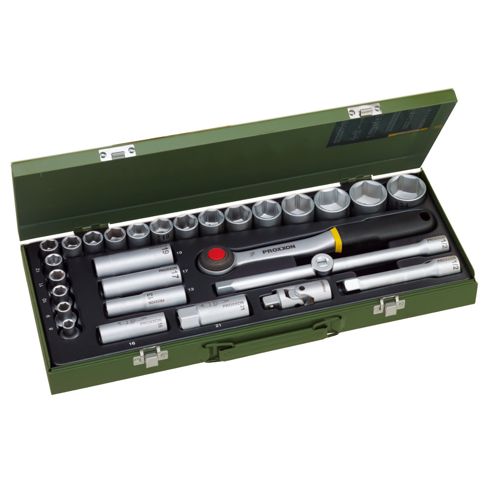 Jeu d'outils de 29 pièces au design de qualité supérieure. Douilles de 8 à 34 mm, y compris inserts de bougie d'allumage de 16 et 21 mm. Idéal pour une utilisation puissante. Dans un coffret en acier.