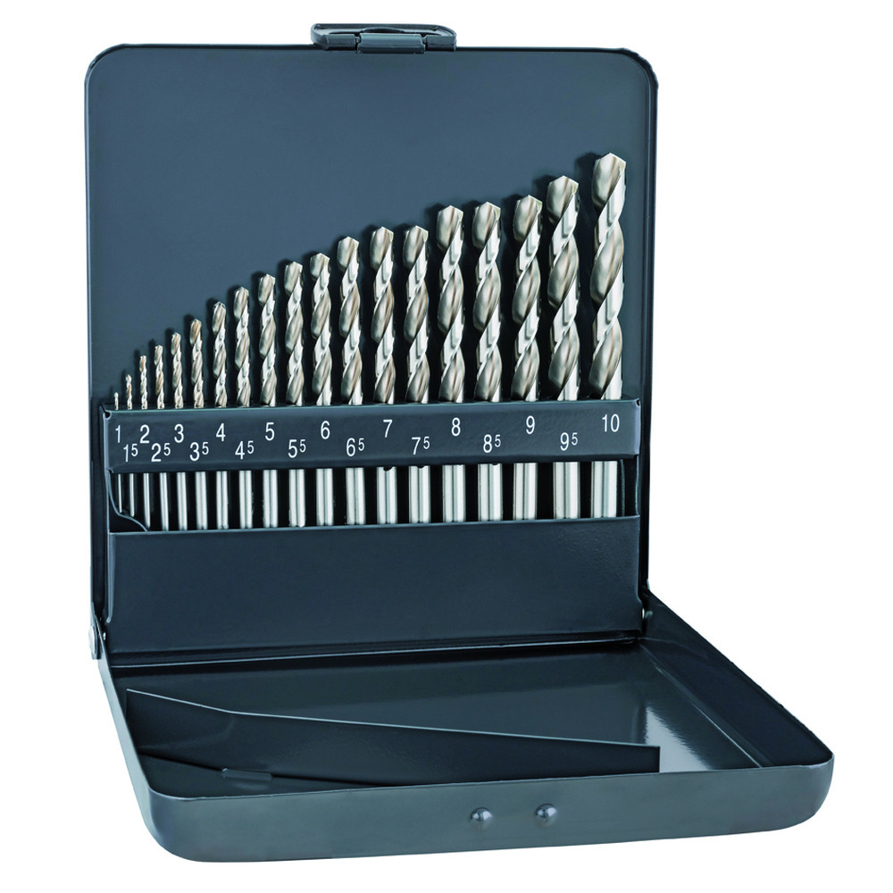 Foret hélicoïdal professionnel HSS dans une version rectifiée pour une longue durée de vie et des performances de perçage optimales. Cassette métallique équipée de forets de 1,0 à 10,0 mm au pas de 0,5 mm.
