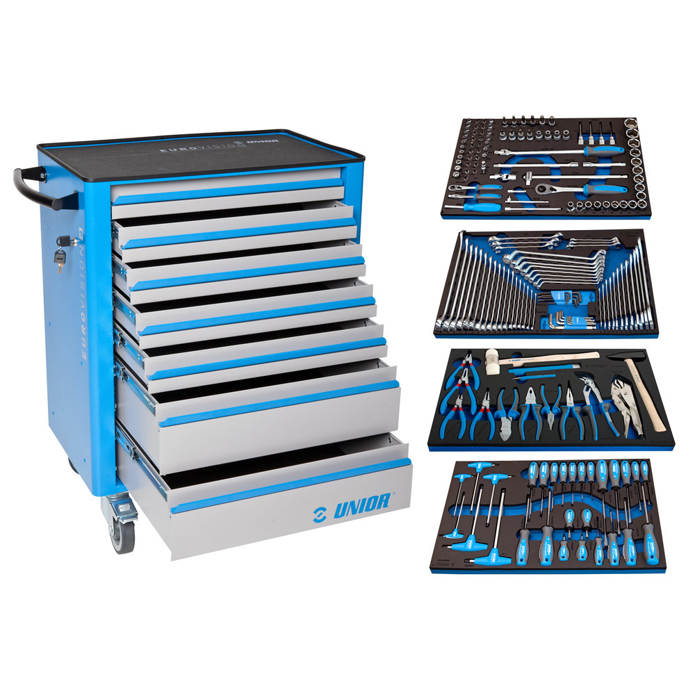 Chariot à outils professionnel avec 7 tiroirs et une capacité de charge de 40 kg par tiroir. Capacité de charge totale : 400 kg, fermeture par sécurité individuelle des tiroirs ou verrouillage centralisé. Composition pratique - idéale pour un usage commercial, industriel ou bricolage prolongé ! Équipé de 193 pièces. Gamme d'outils professionnels avec les outils les plus importants. Tout ce qui est au design de haute qualité convient également à un usage commercial. Outils dans les modules SOS pour une organisation optimale et un accès rapide. Peut être étendu à tout moment avec des modules optionnels pour des applications spéciales. Modèle spécial, disponible uniquement pour une courte période !